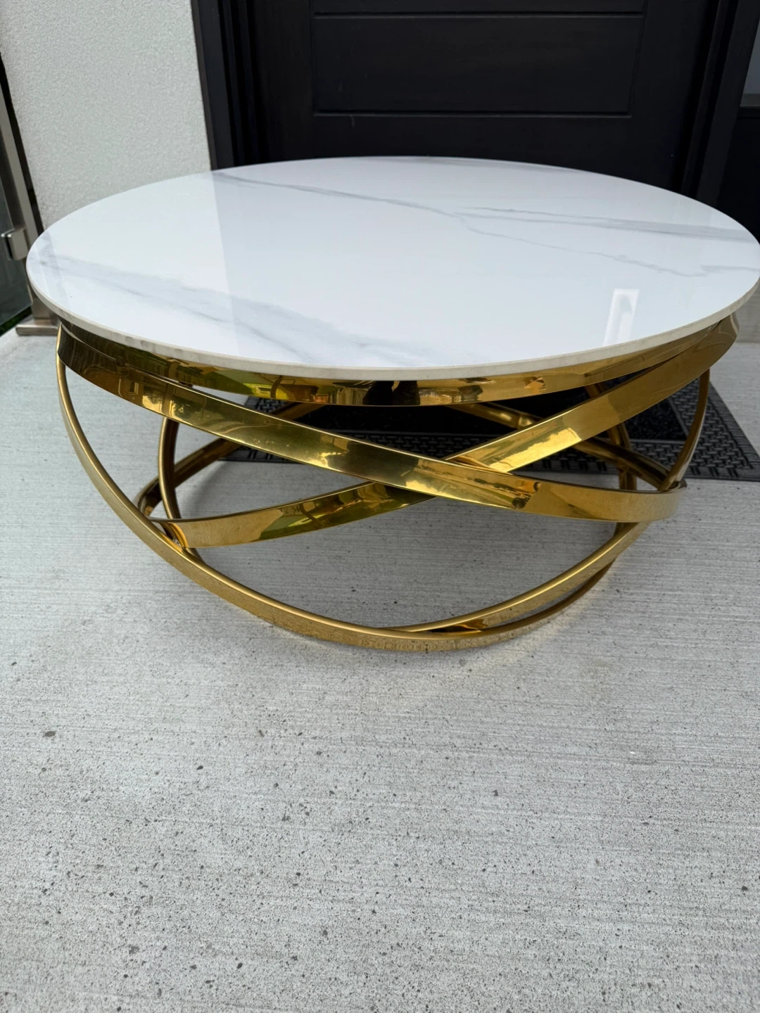 Selling a stylish round coffee table! It features a beautiful white marble top and a unique gold-coloured base. This table would add a touch of elegance to any living space. It’s in great condition and ready for a new home!