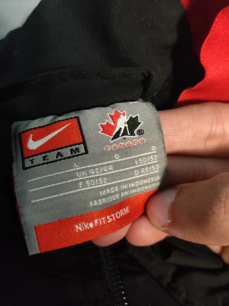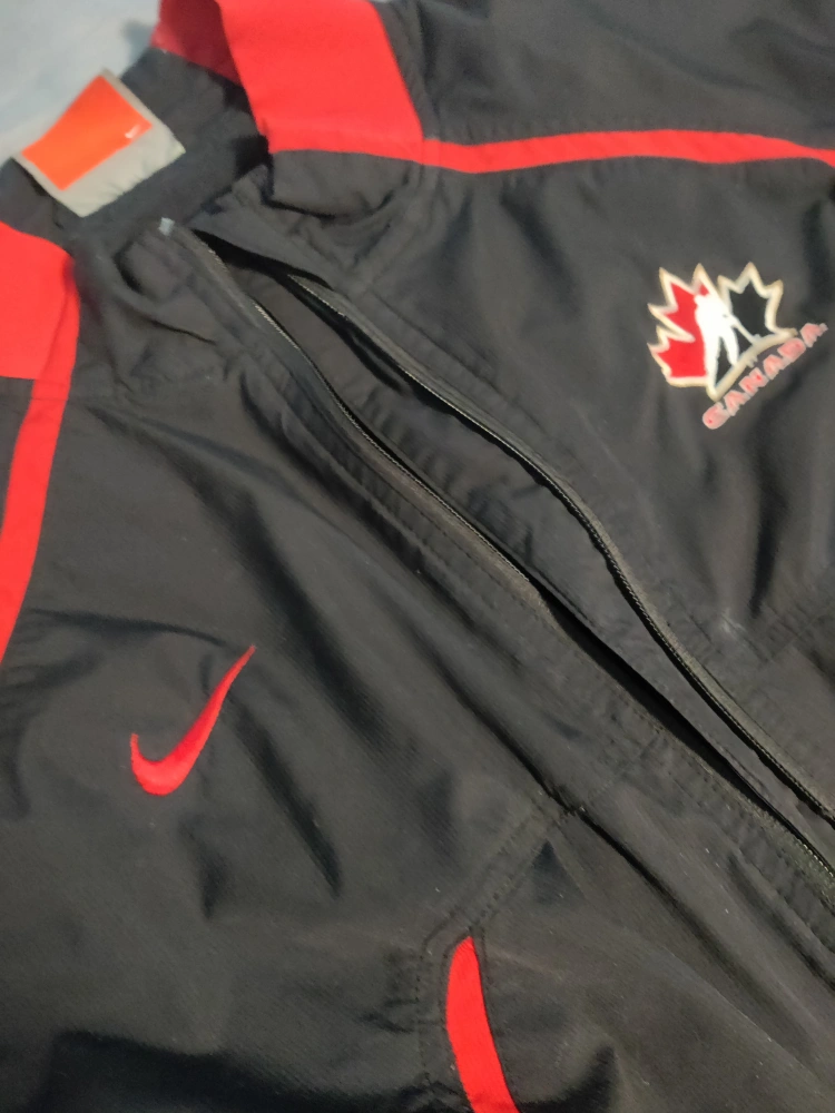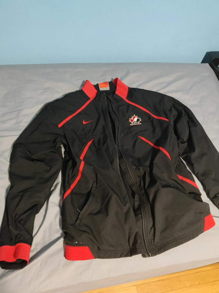 Selling a Nike Team Canada jacket in size L. It's black with red accents and the Team Canada logo on the chest.