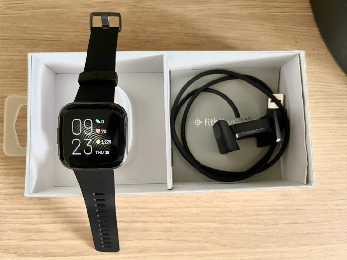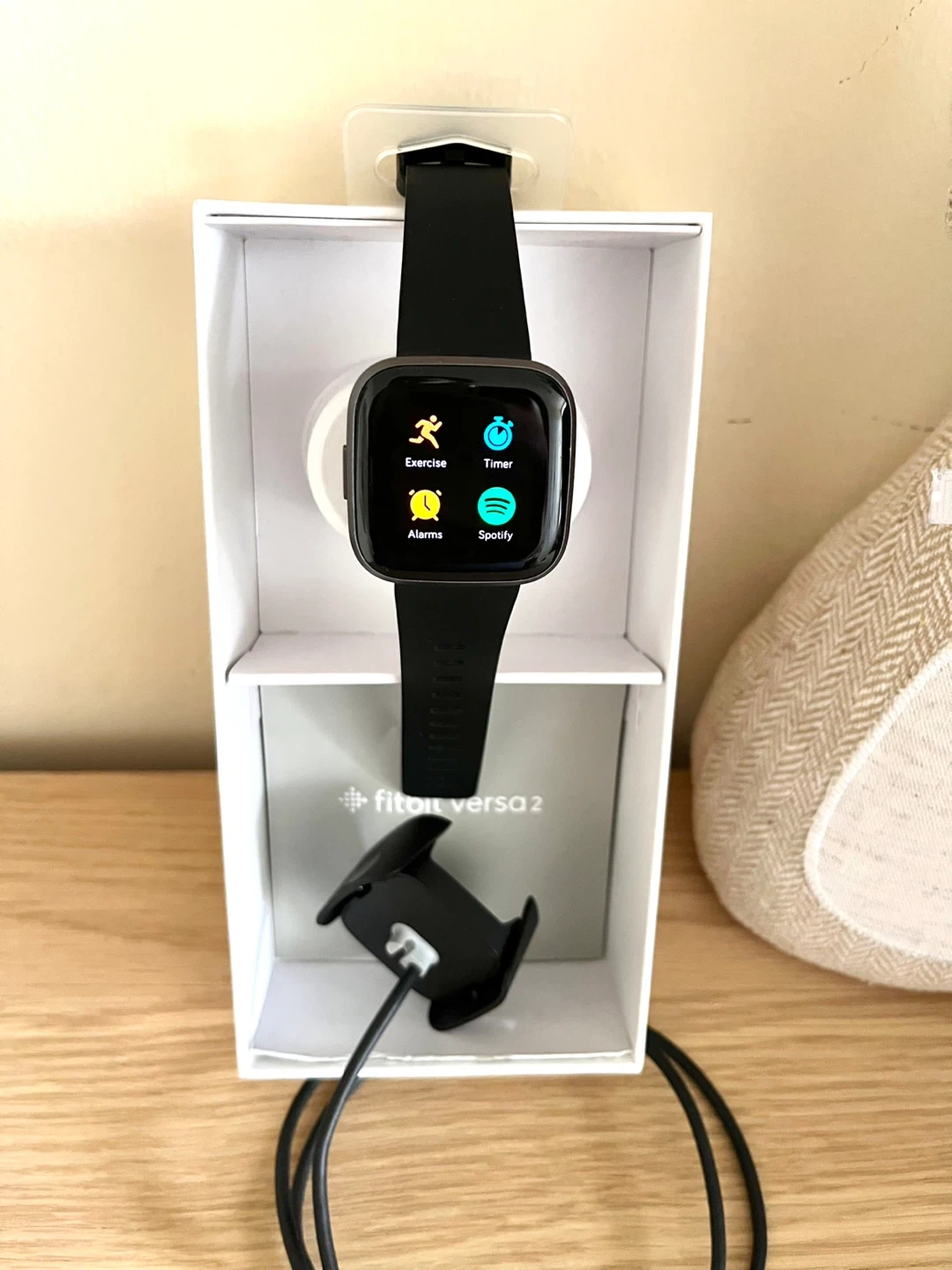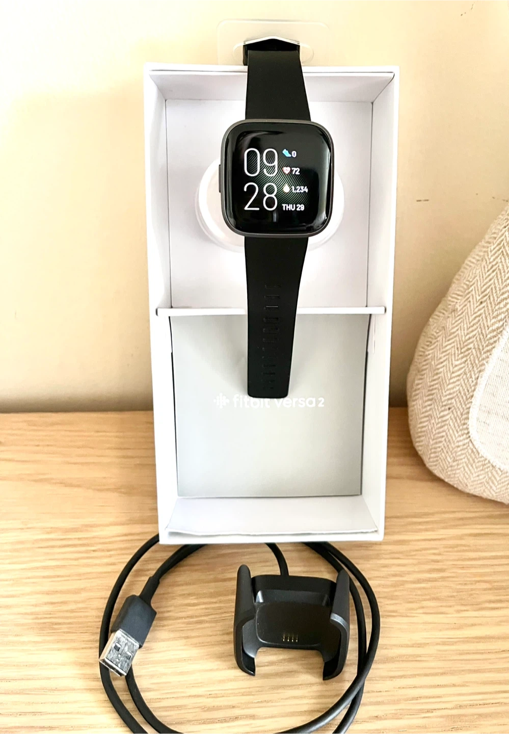 Selling a Fitbit Versa 2 in black! It comes with the original box, charger and belt. ✅ It's in like new condition and ready for a new owner.