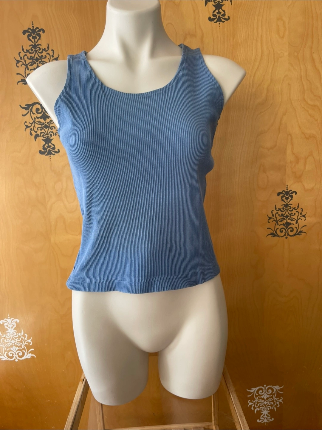Vintage 90s Blue Ribbed Cropped Tank Top Sleeveless Organic Cotton Scoop Neckline S/M 💎Certified authentic vintage 90s - RARE FIND in AMAZING CONDITION! Measurements (Inches): **Mannequin is overall size medium **Clothing measured on flat surface - ONLY LEFT TO RIGHT - NOT ALL AROUND CIRCUMFERENCE Size: XS - Medium Shoulder to shoulder: 10 Bust: 15 Waist: 14 Hips: 15 Armpit Width: 10 Length from shoulder to bottom hem: 19 Details: Color: Blue Length: almost crop top length. Inches above the hips - perfect style for high waisted bottoms Scoop neckline Sleeveless Ribbing texture 100% organic cotton - hypoallergenic - very soft - there is also stretch Fitted & bodycon Perfect for layering & casual outings