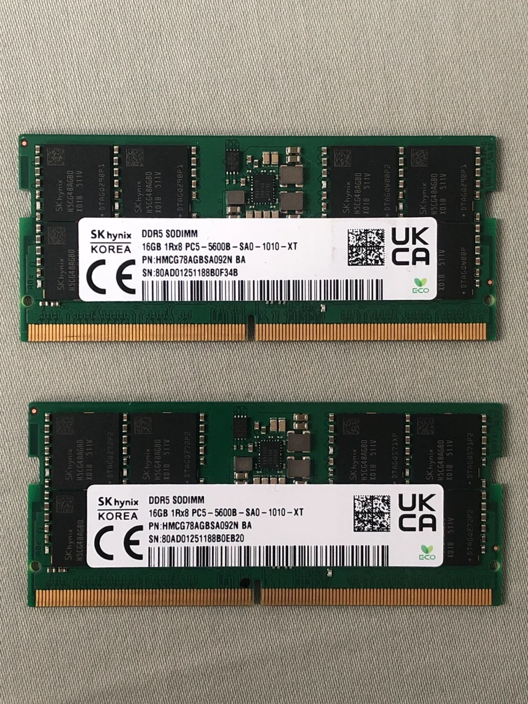 Selling two SK Hynix 16GB DDR5 SODIMM RAM sticks. They are 16GB 1Rx8 PC5-5600B -SA0-1010-XT. 2 pieces available. $35 for each. $60 for both.