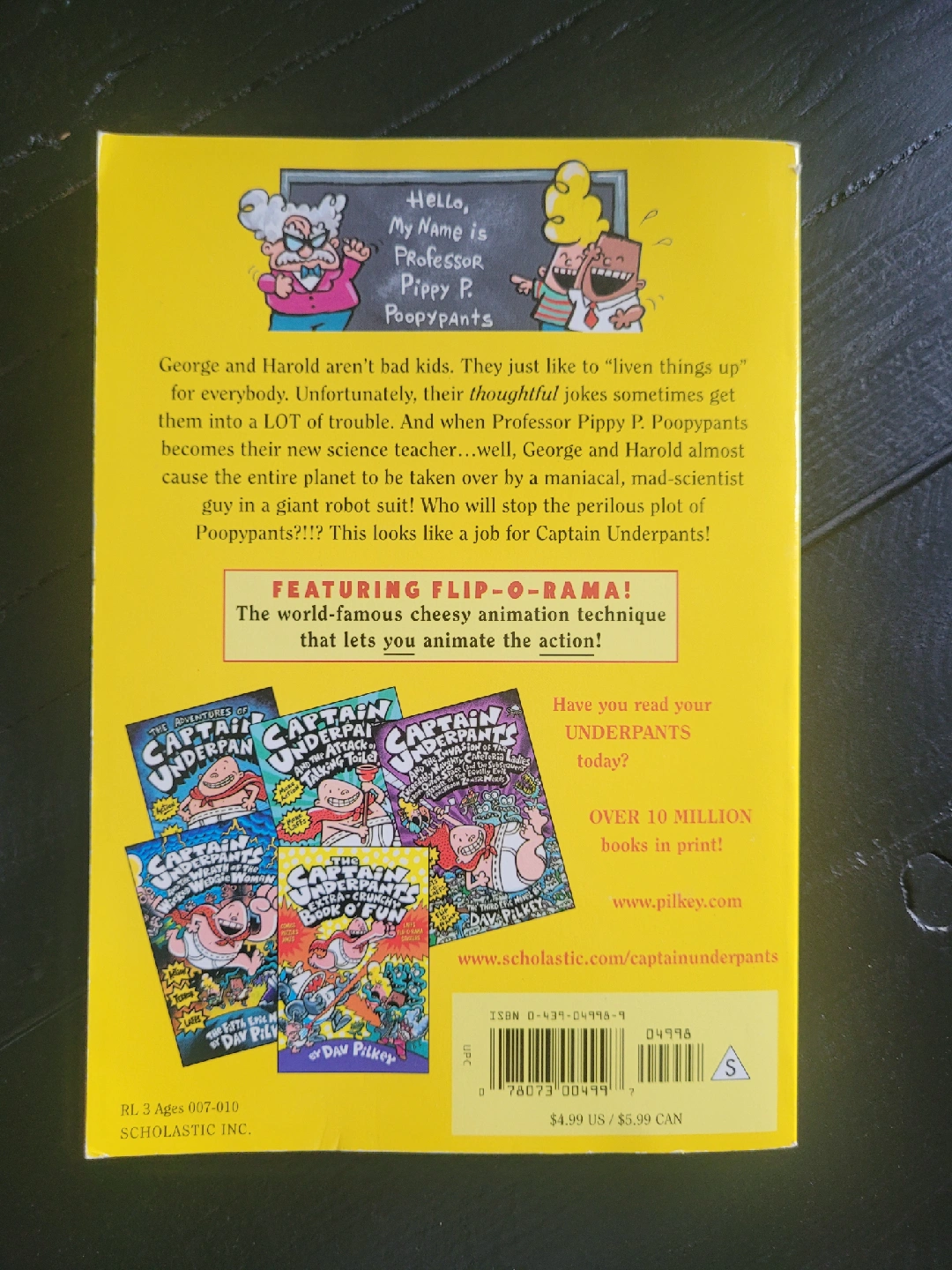 Selling Captain Underpants and the Perilous Plot of Professor Poopypants! This is the fourth epic novel by Dav Pilkey. It's a world-famous cheesy animation technique that lets you animate the action! Over 10 million books in print, so you know it's good