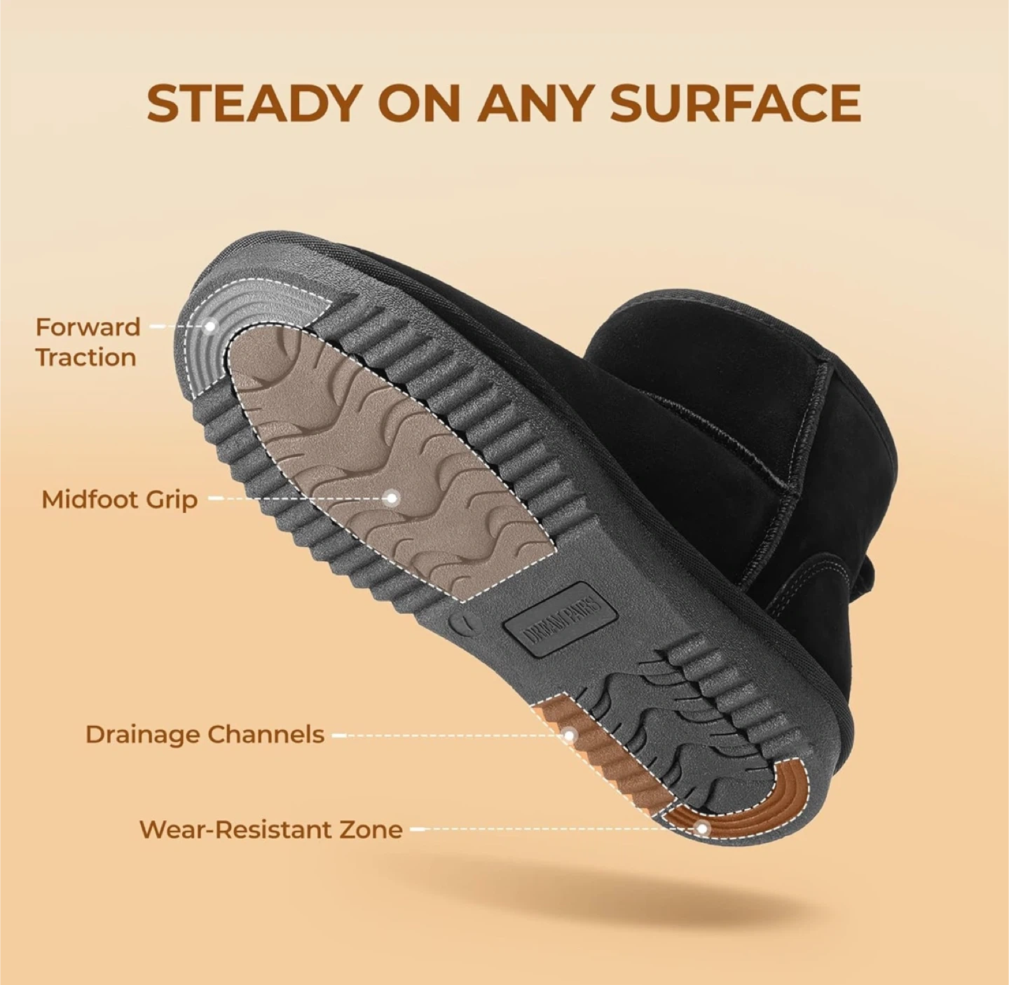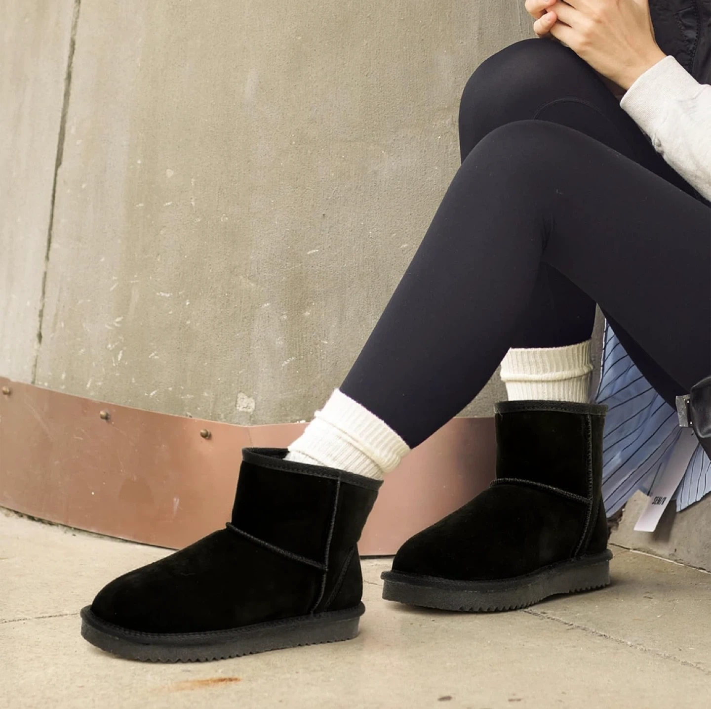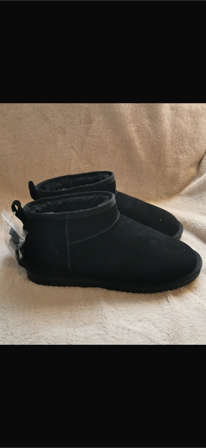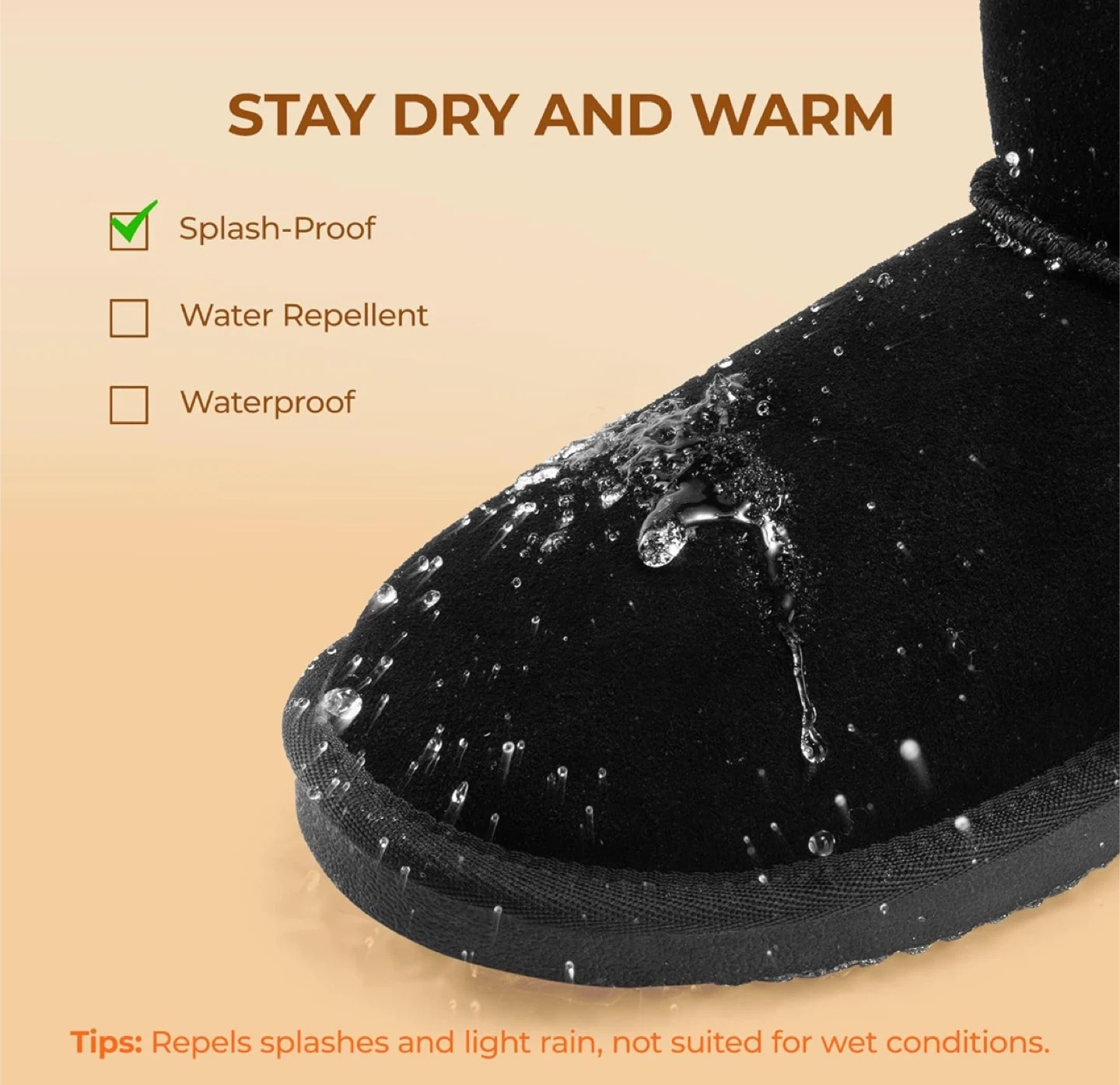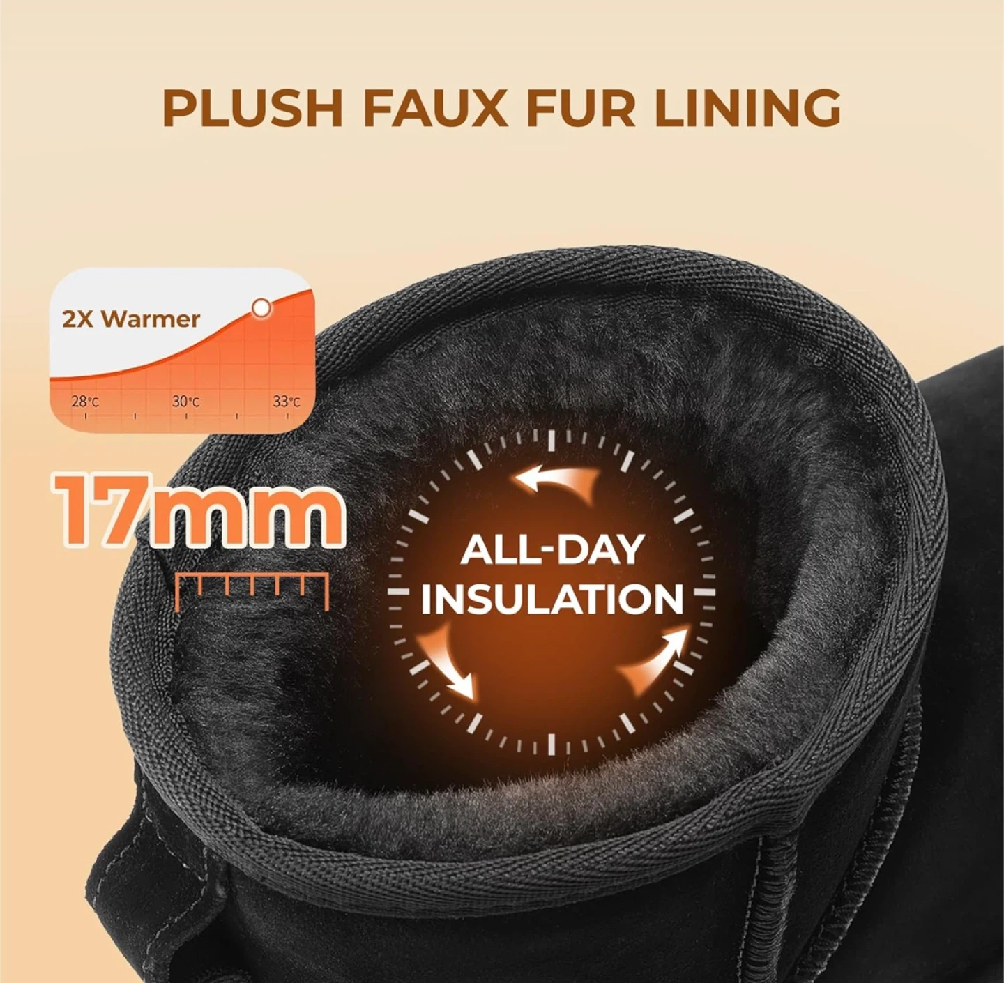 New! Retails for $55 These mini boots are made with genuine suede leather and have a plush faux fur lining to keep your feet warm and cozy! They're designed to be splash-proof, so they're great for light rain and snow. The boots are black, making them a versatile addition to your wardrobe Genuine Leather Upper: These womens snow boots feature a 100 percent premium genuine suede leather upper, offering a delicate and skin-friendly touch that showcases luxury and durability. Soft Faux Fur Lining: Lined with 100g of soft faux fur, these women’s winter boots provide exceptional warmth and a coziness for your feet. Slip-Resistant & Durable: The TPR outsole not only offers outstanding durability but also excellent grip. These slip-resistant snow boots for women ensure stability on rainy days or snowy terrain. Memory Foam Insole: With a specially designed 5mm memory foam insole, these warm snow boots offer superior cushioning to reduce fatigue during walking and provide thoughtful care. DIY Ribbon: These winter boots for women include a matching DIY ribbon, allowing you to personalize your style according to your preferences.