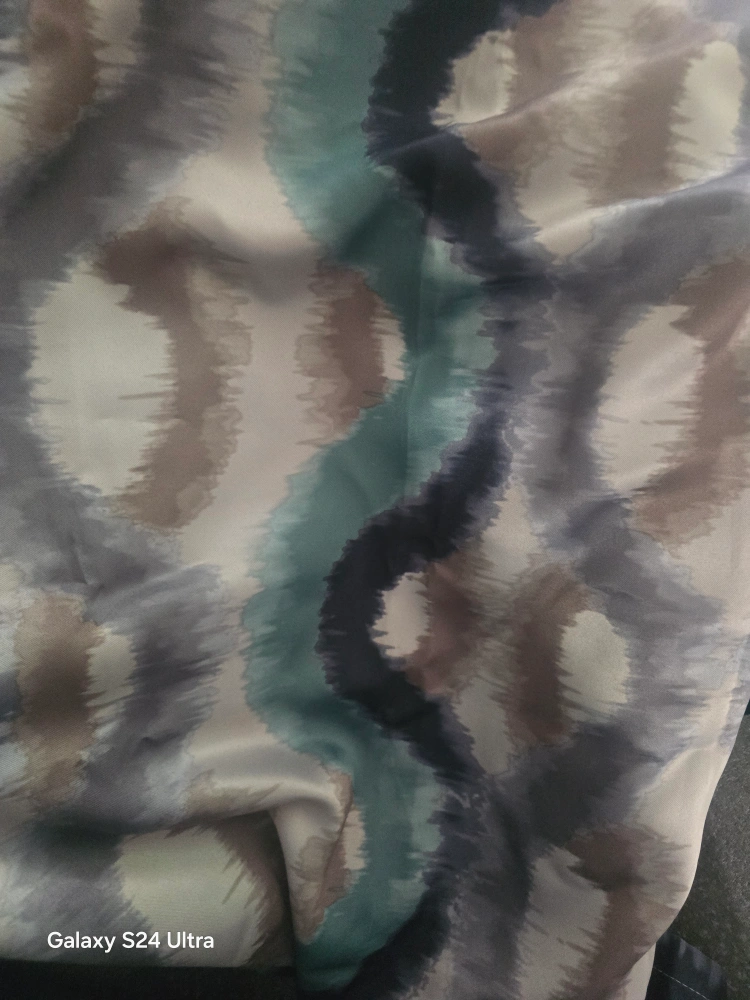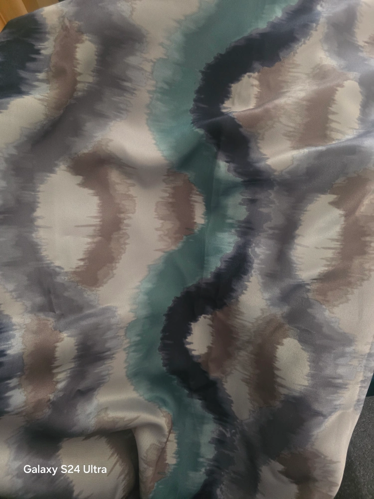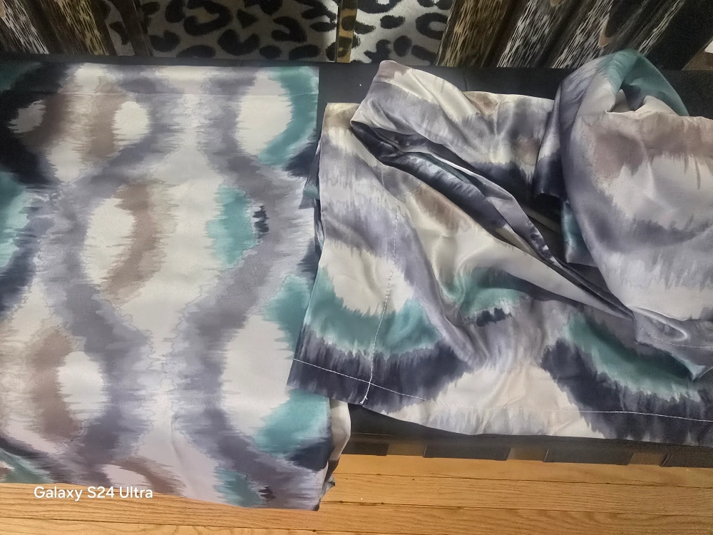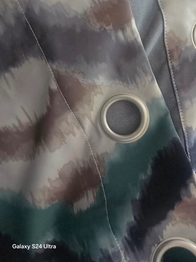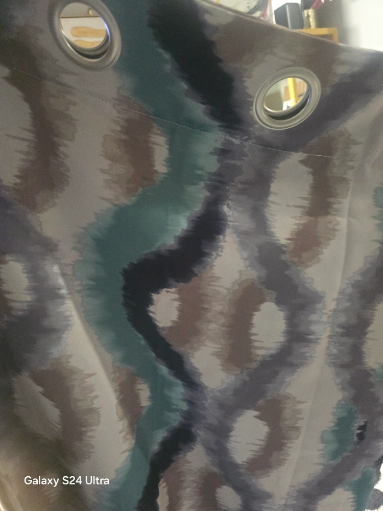 These curtains have a beautiful, flowing pattern in shades of grey, teal, and brown. They're perfect for adding a touch of elegance to any room. They have grommets at the top for easy hanging smoke free