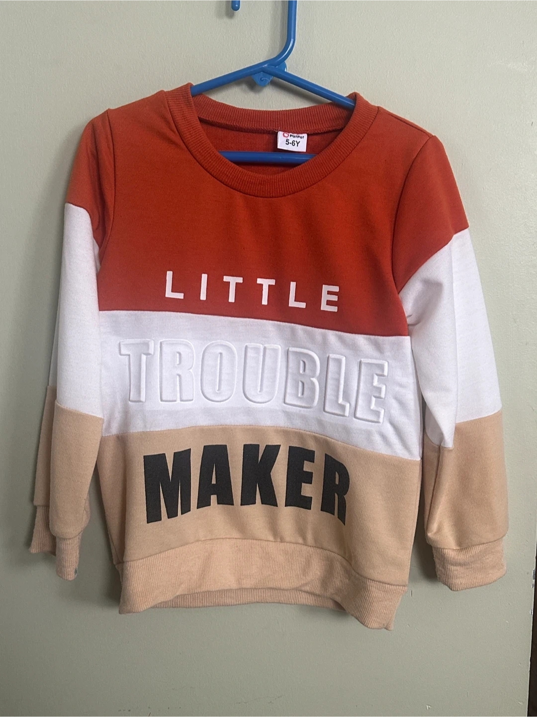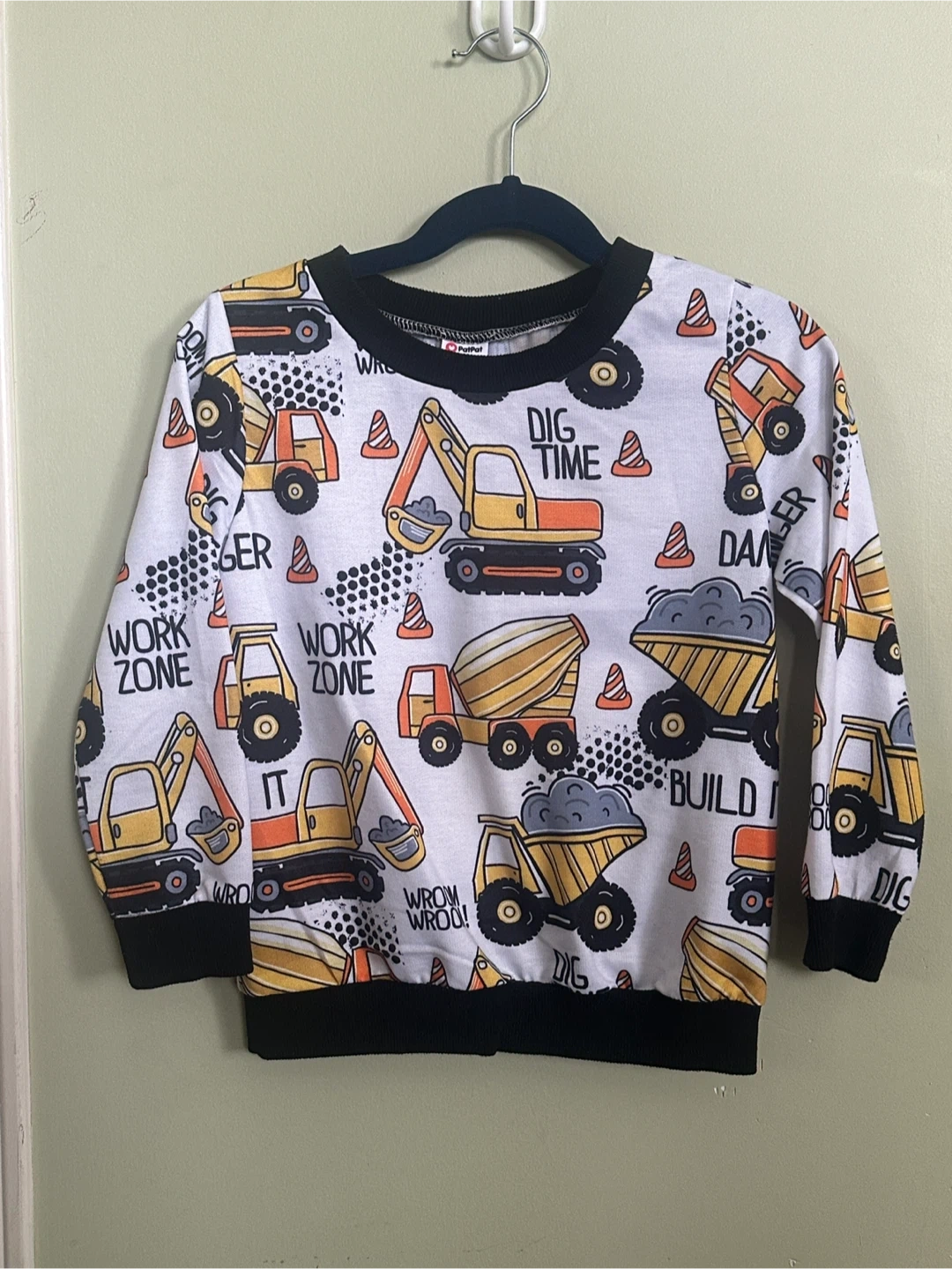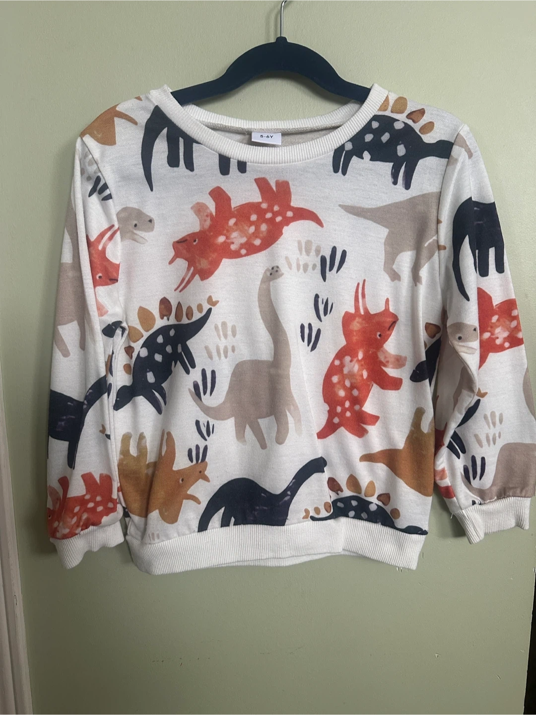 One piece $10. Full bundle $40 Selling a bundle of four kids' sweaters and sweatshirts all in size 5-6Y. There's a fun "Little Trouble Maker", a dinosaur print one, a blue knit sweater, and one with construction vehicles. Great for keeping your little one warm and stylish!