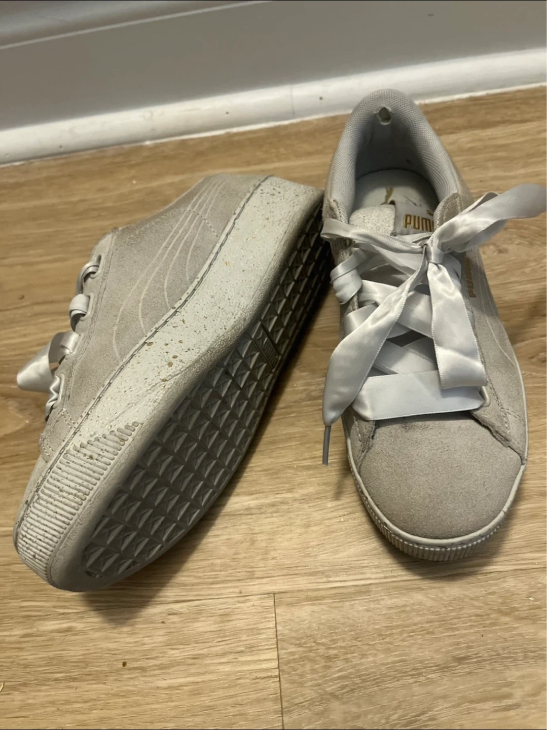 Selling a pair of Puma Suede Platform sneakers in a light grey colour. They are size 6.5 US. These sneakers feature a soft foam insole for extra comfort. They have ribbon laces, too! These shoes are in used condition. Let me know if interested in purchasing from me thx ๐๐ Pick up at Moss Park Apartments (exact address will be given once a meetup is decided) ๐ Check out my listings for more deals! ๐คฉ ๐ฅ Bundle items for a discounted price (excluding items $5 and under)๐ฅ