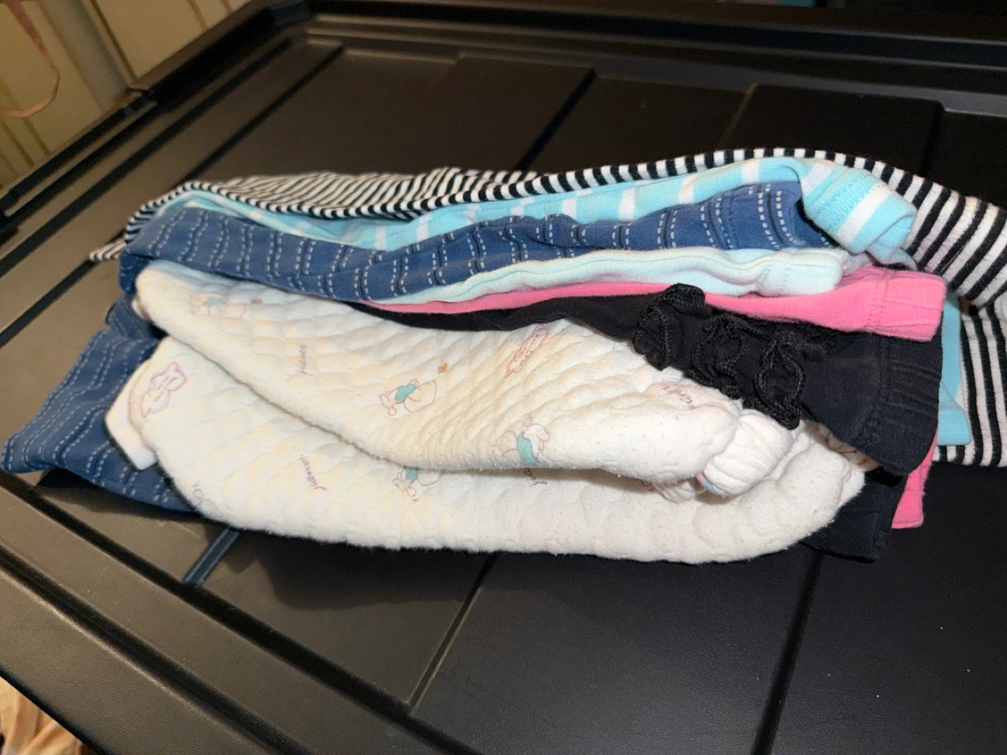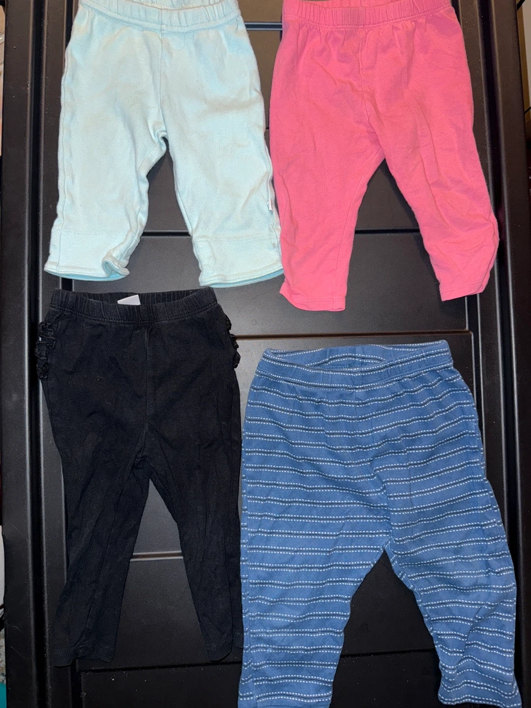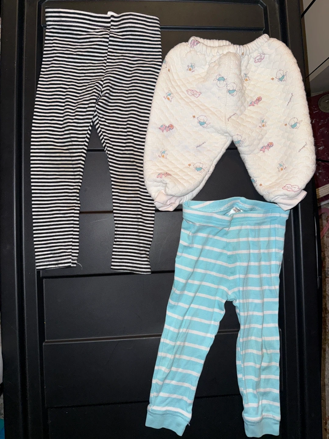 Selling a bundle of baby and toddler pants in mixed sizes! There are several pairs of pants in different colours and patterns, perfect for everyday wear. They're in good used condition and ready for a new home