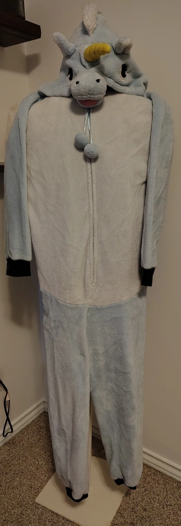 Selling a cute unicorn onesie! It's an adult size and made of a soft, plush material. Perfect for lounging around the house or for a costume party. It's ready for a new home! fits small-medium, lots of room and stretches