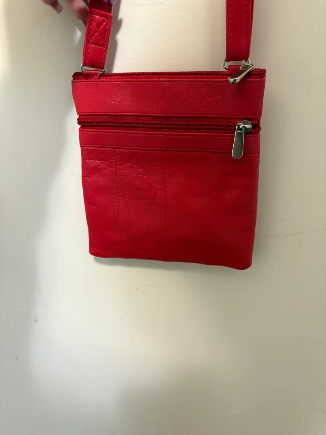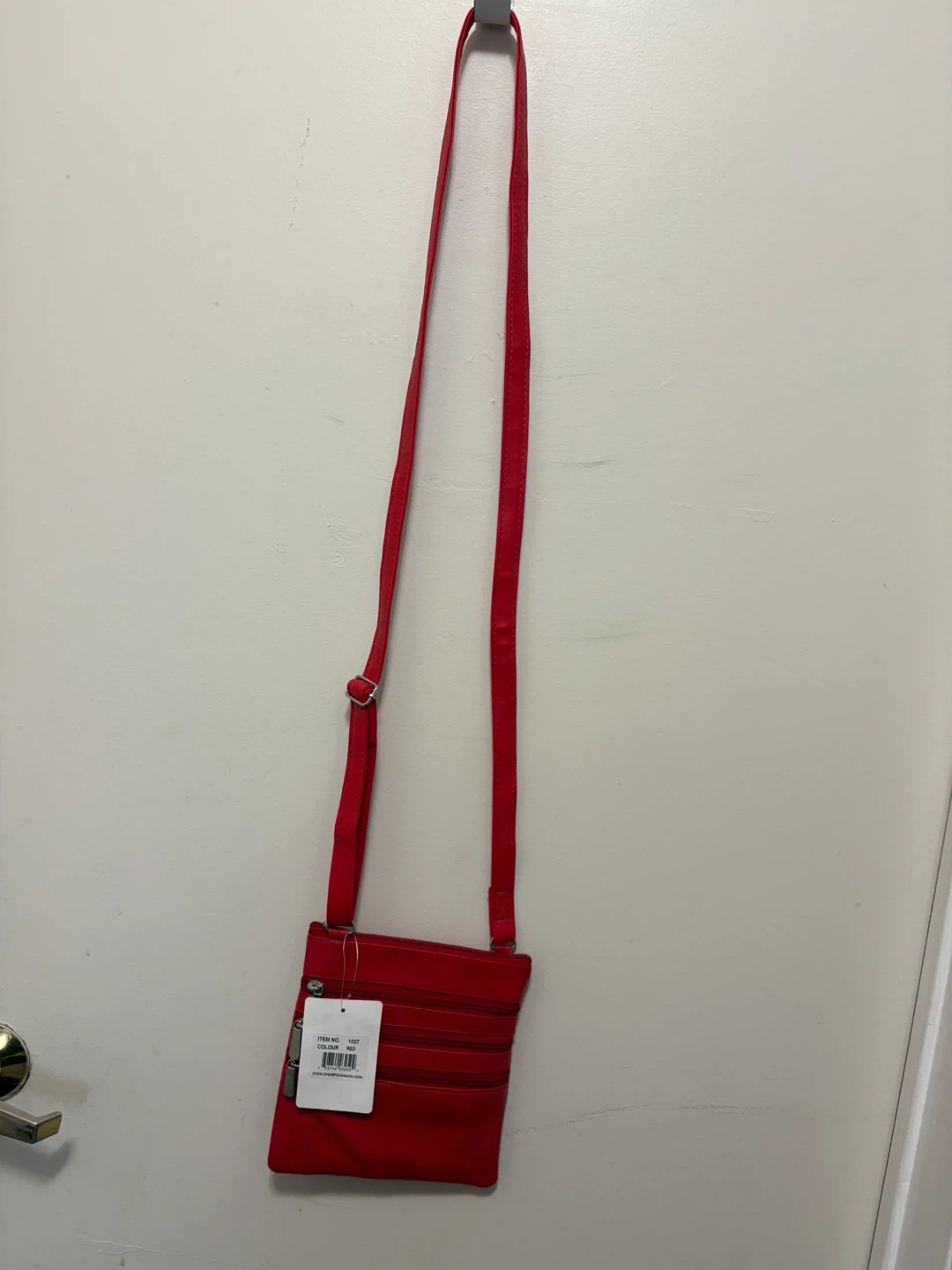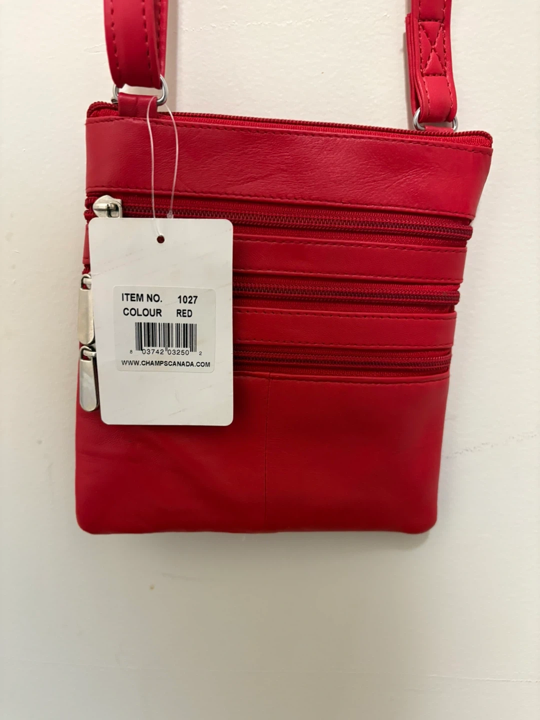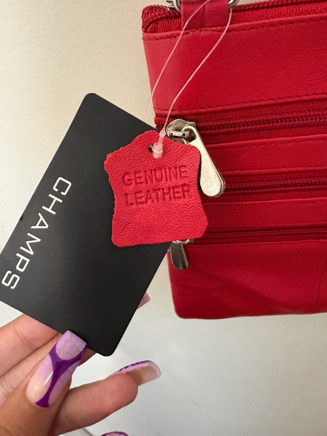 This is a brand new Champs crossbody bag! It's a vibrant red colour and made of genuine leather. Still has the original tags attached! Features & Details: - 7.5"H x 7"W - 5 pockets - Adjustable shoulder strap Originally paid: $50 Payment: Cash only Location: Rossland and Church, Ajax or Durham College Oshawa