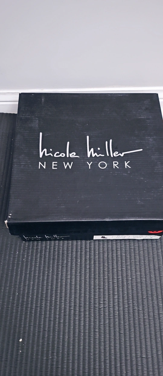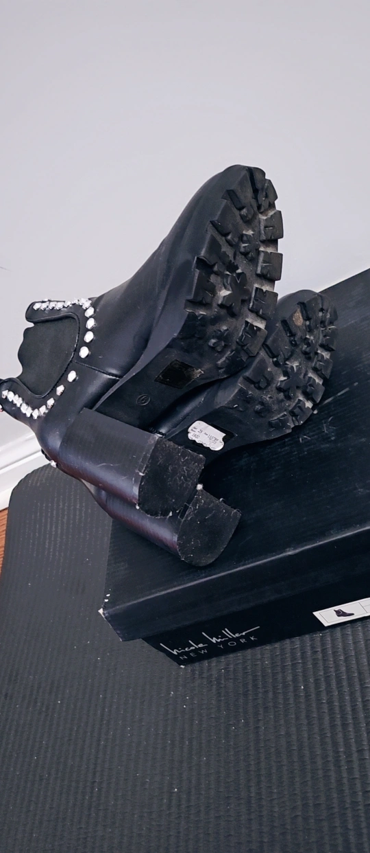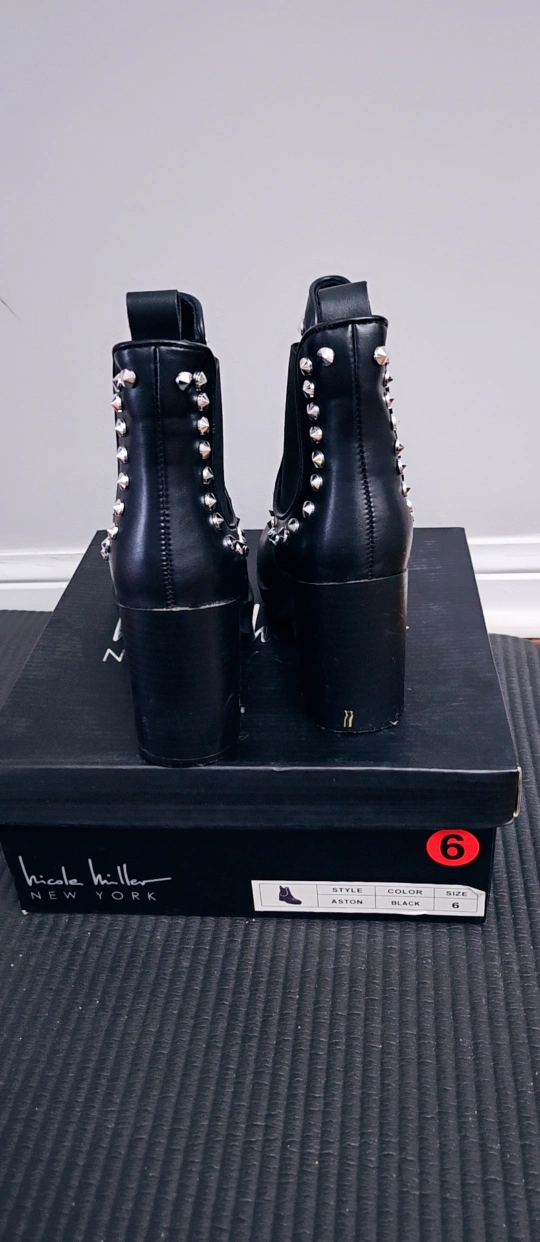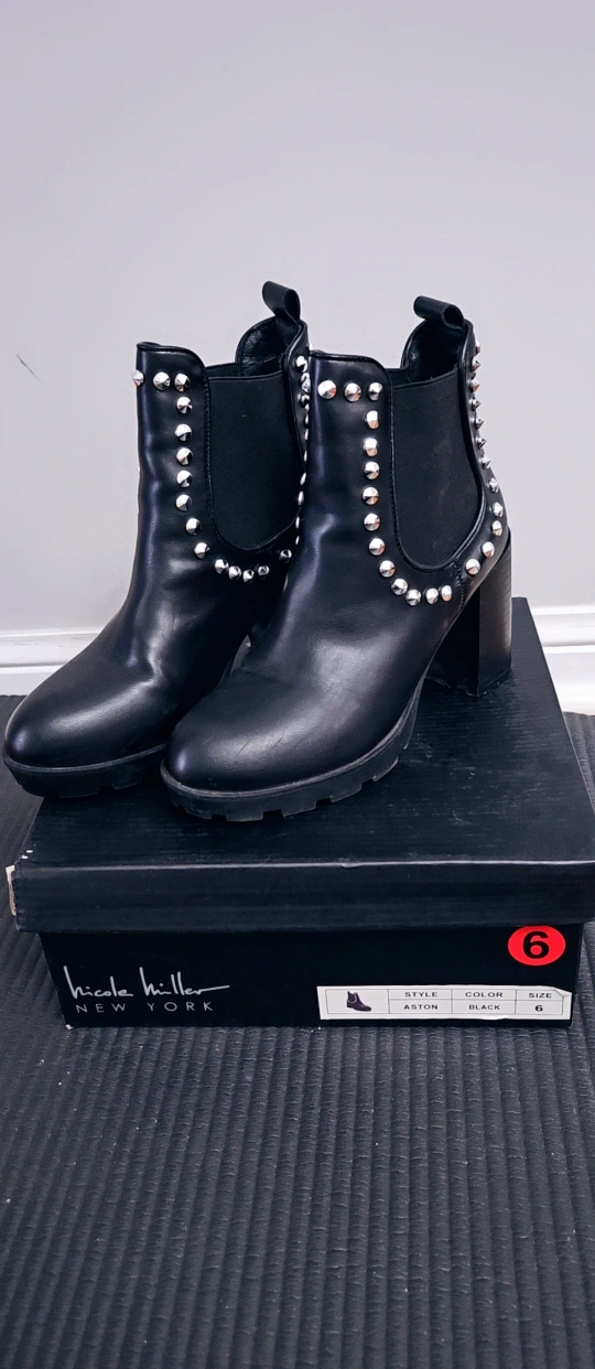 Selling a pair of Nicole Miller New York ankle boots in black. They're a size 6 and come with the original box. These stylish boots feature studded detailing and a chunky heel, perfect for adding a bit of edge to your look!