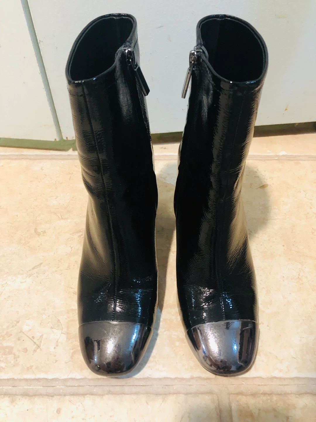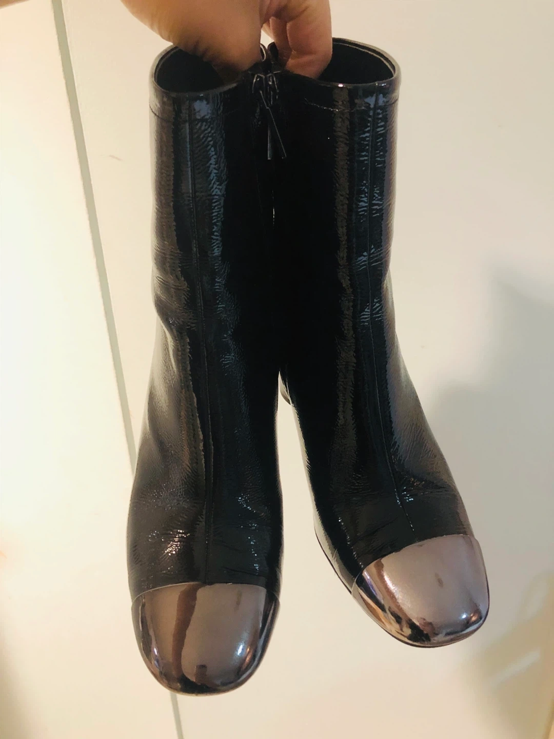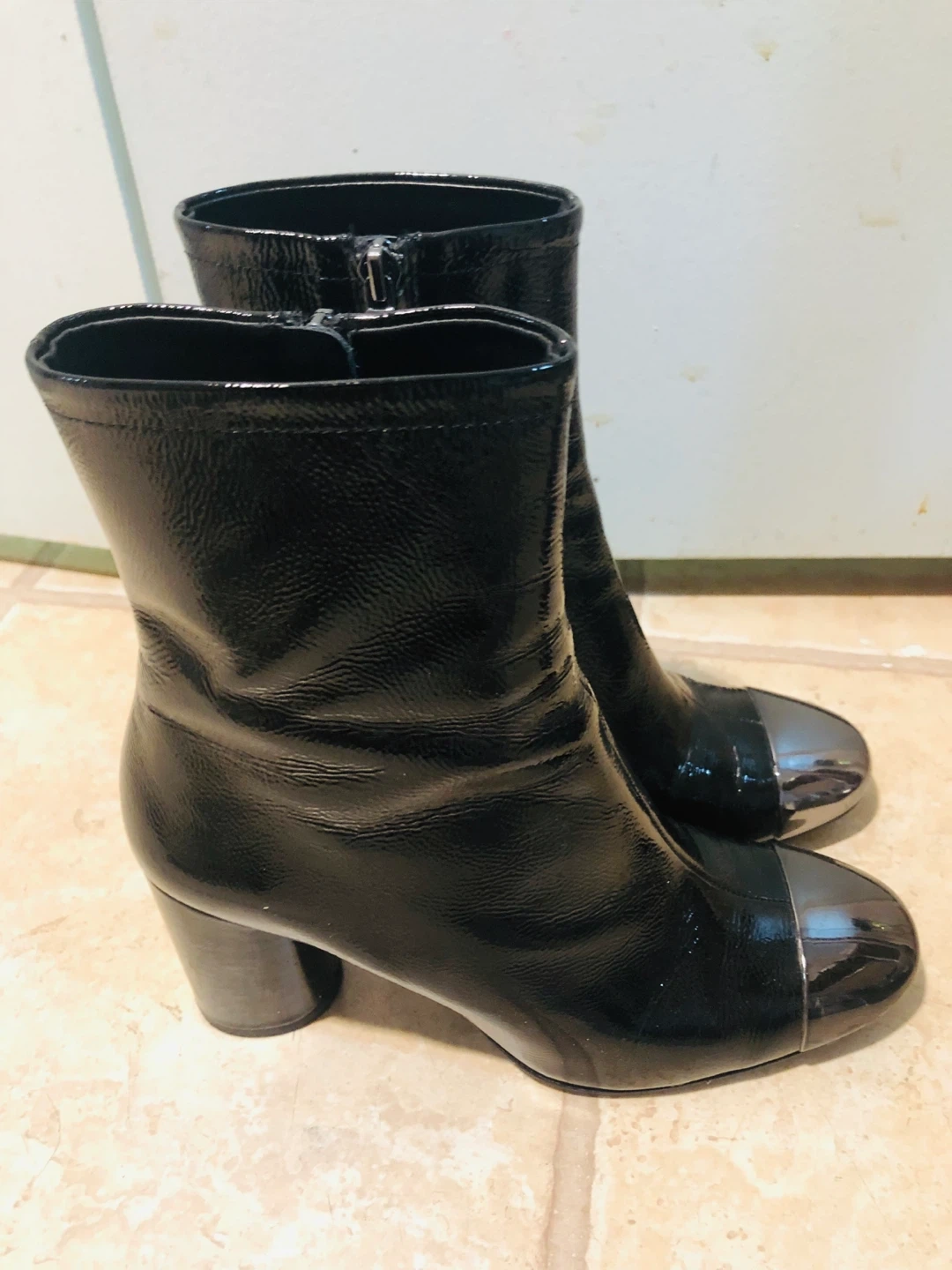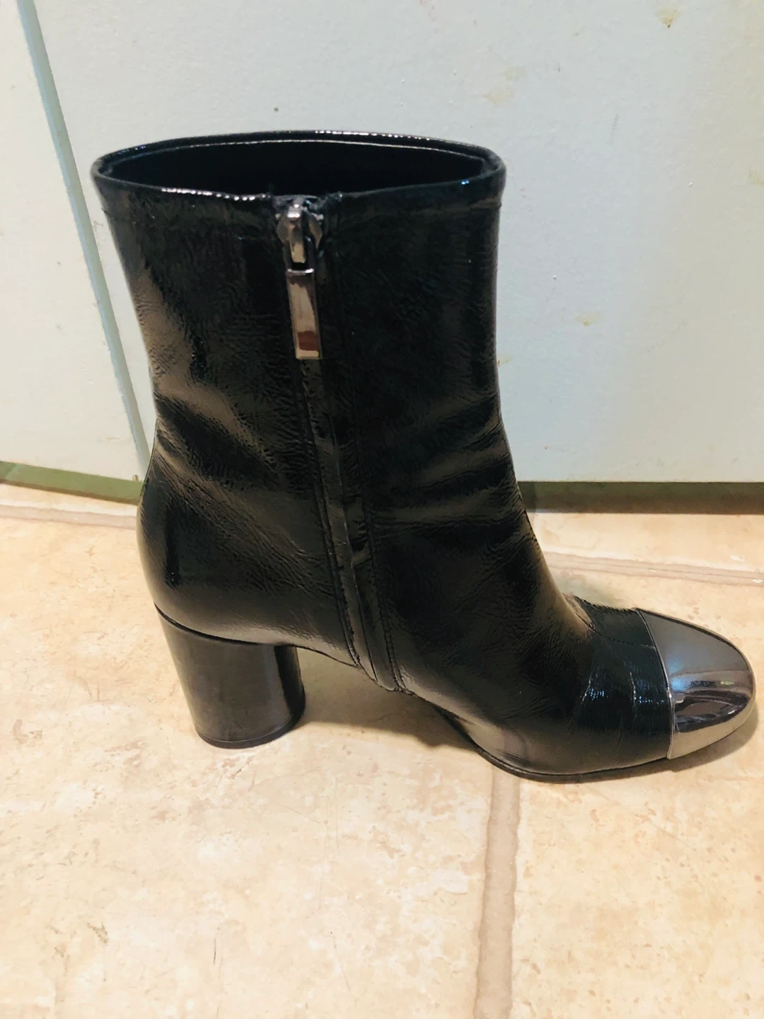 These are a pair of black ankle boots with a unique silver toe detail! They have a zipper on the side for easy wear and a block heel. They are in great condition and ready for a new home