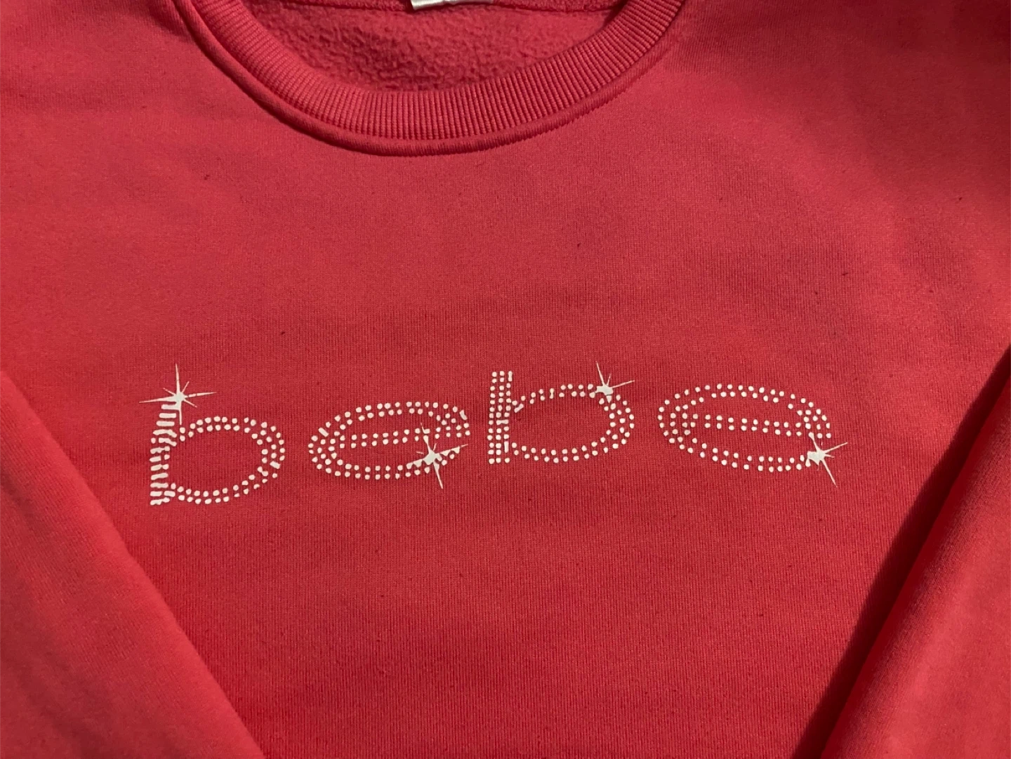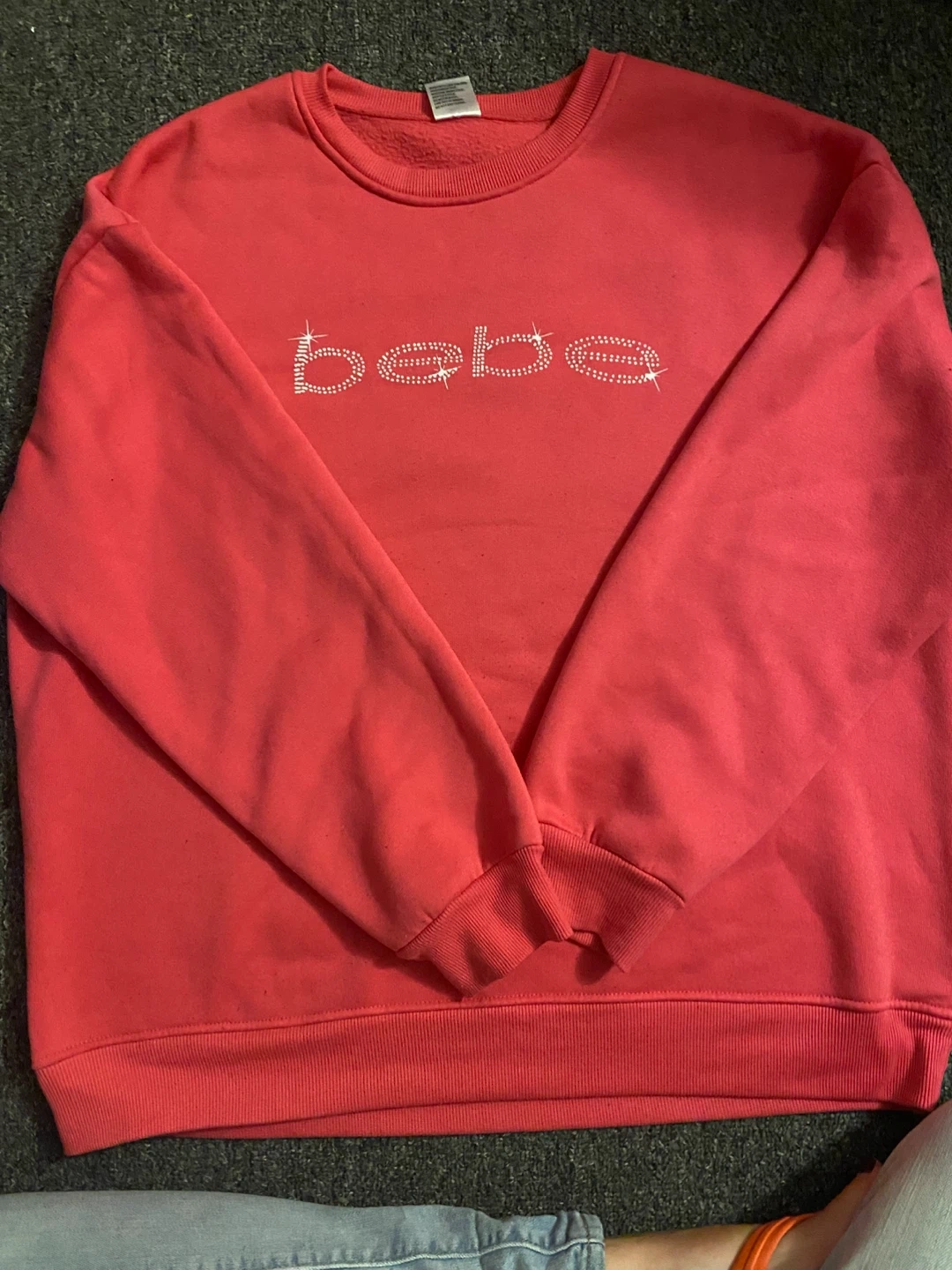 Selling a pink Bebe sweatshirt in size XL. It's made of 100% polyester and features the Bebe logo in rhinestone print (NOT RHINESTONES) A cozy and stylish addition to your wardrobe!