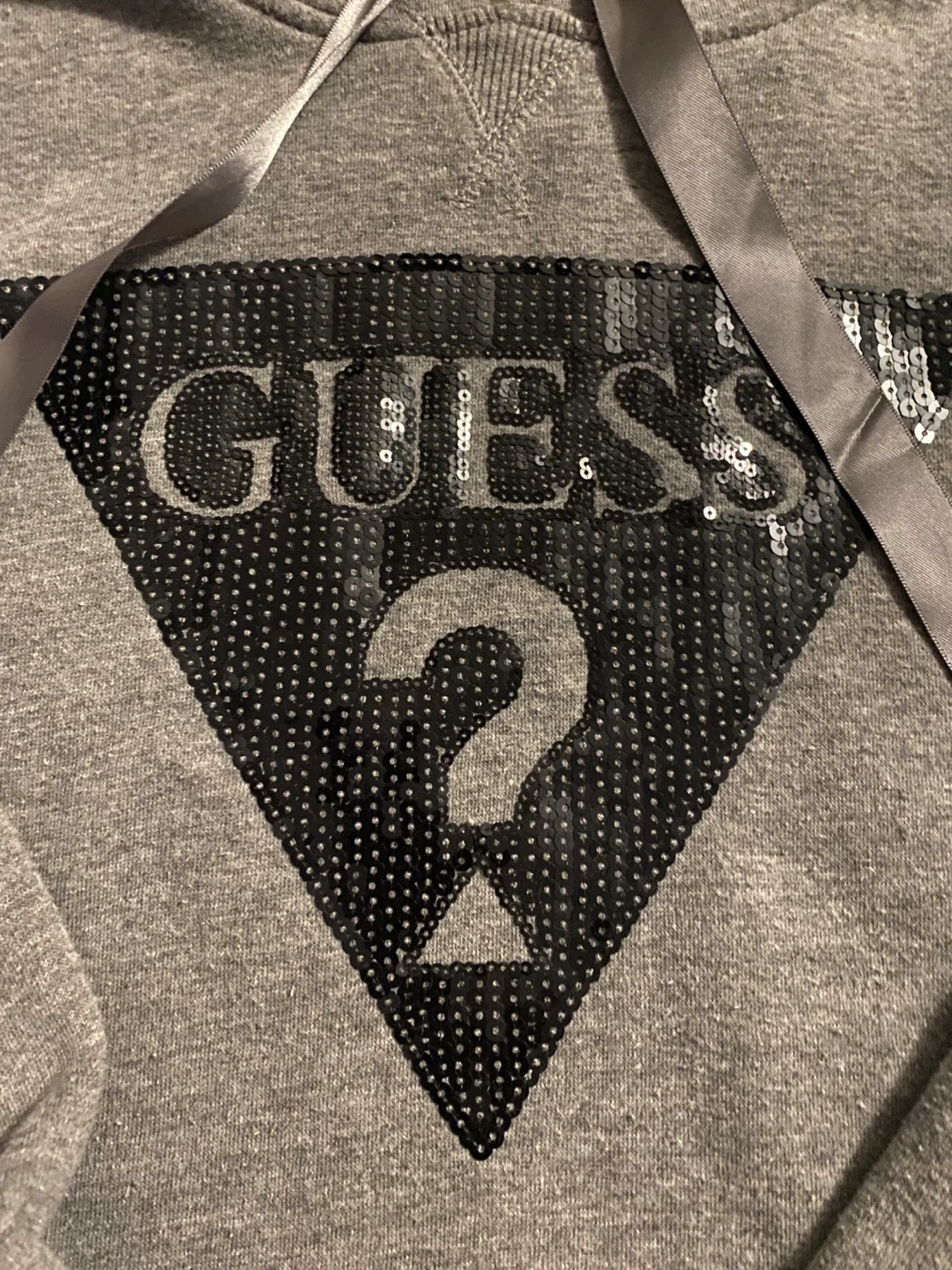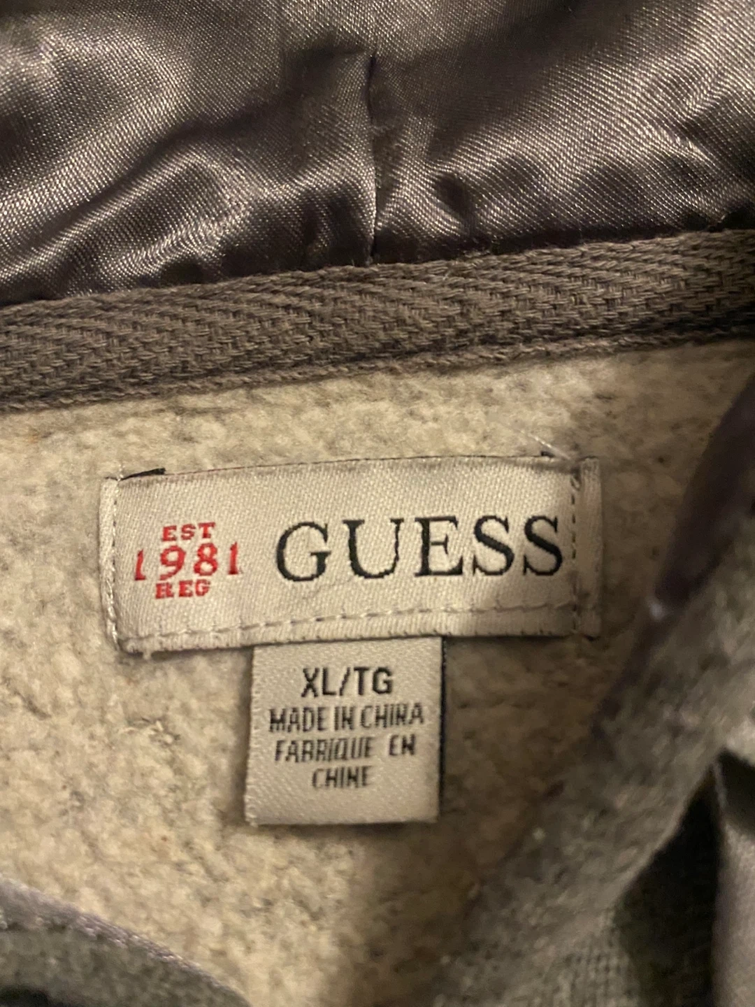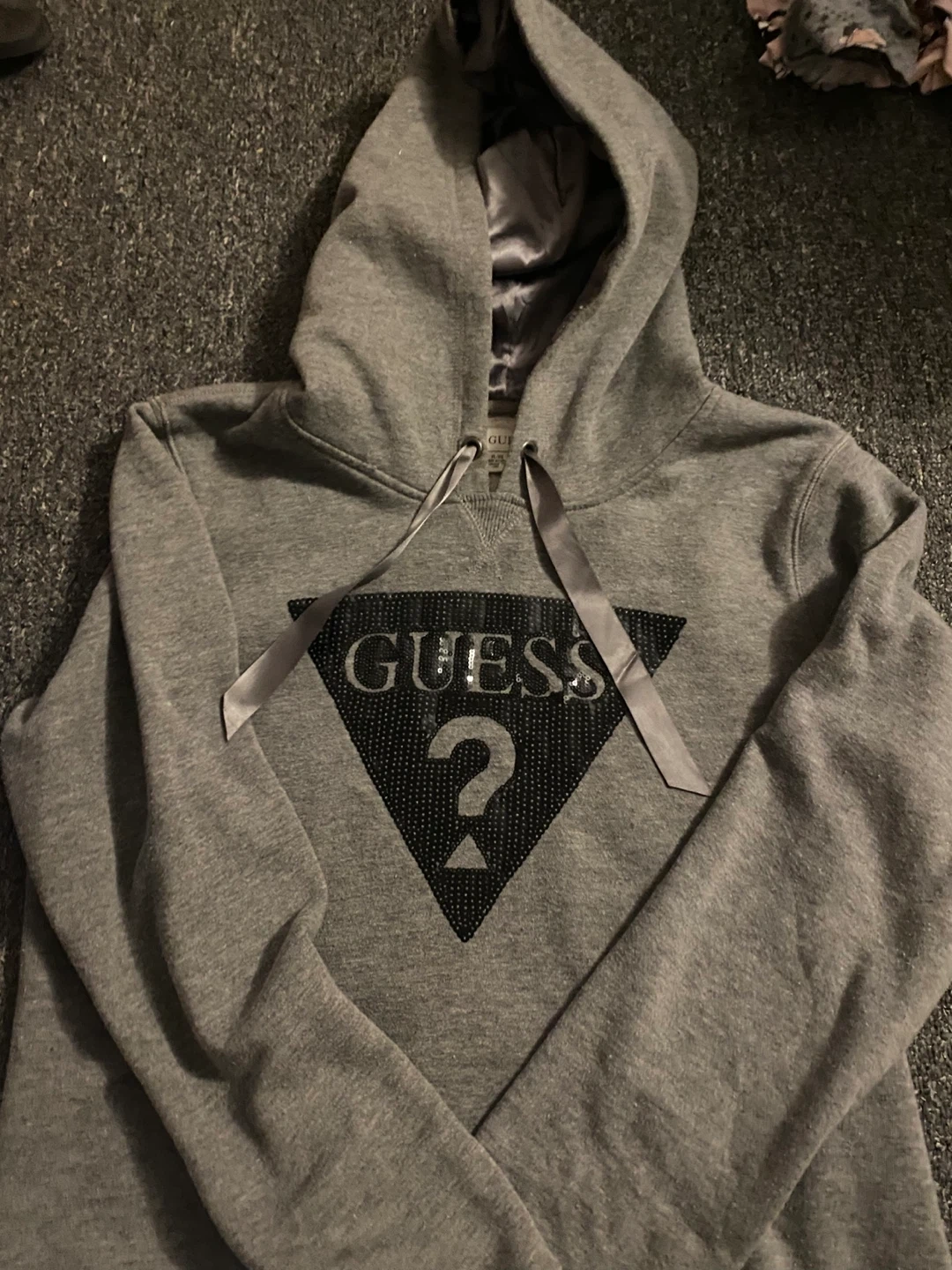 Selling a Guess hoodie in size XL. It's a stylish grey colour with the Guess logo on the front. The hoodie is in great condition and ready for a new home!