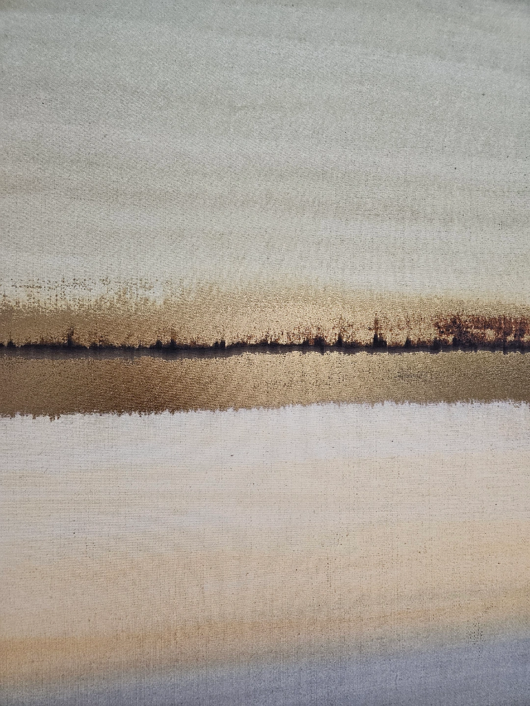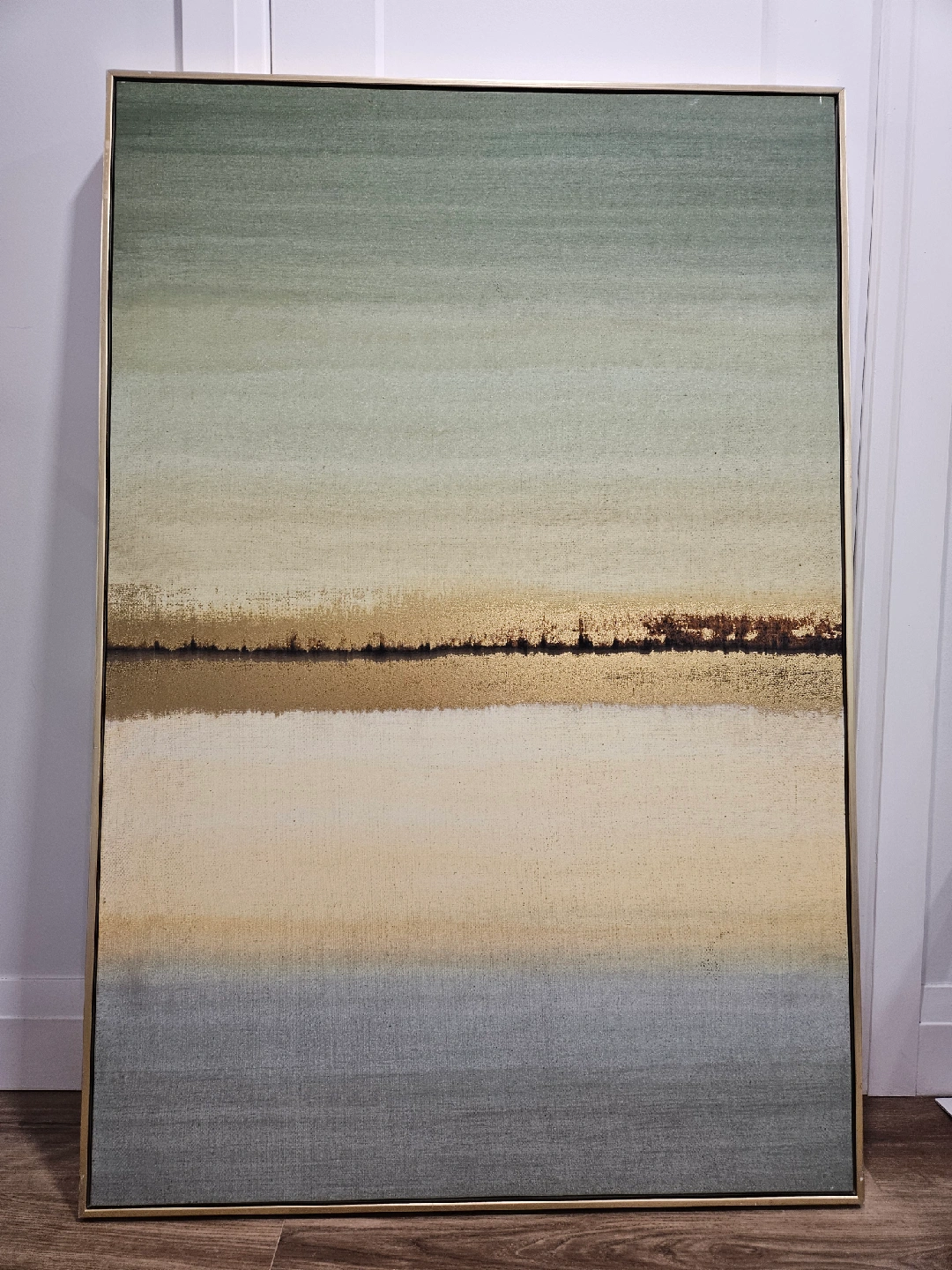 This painting shows an abstract landscape with soft gradient colors, resembling a horizon reflected on water. 32.5 x48 inches