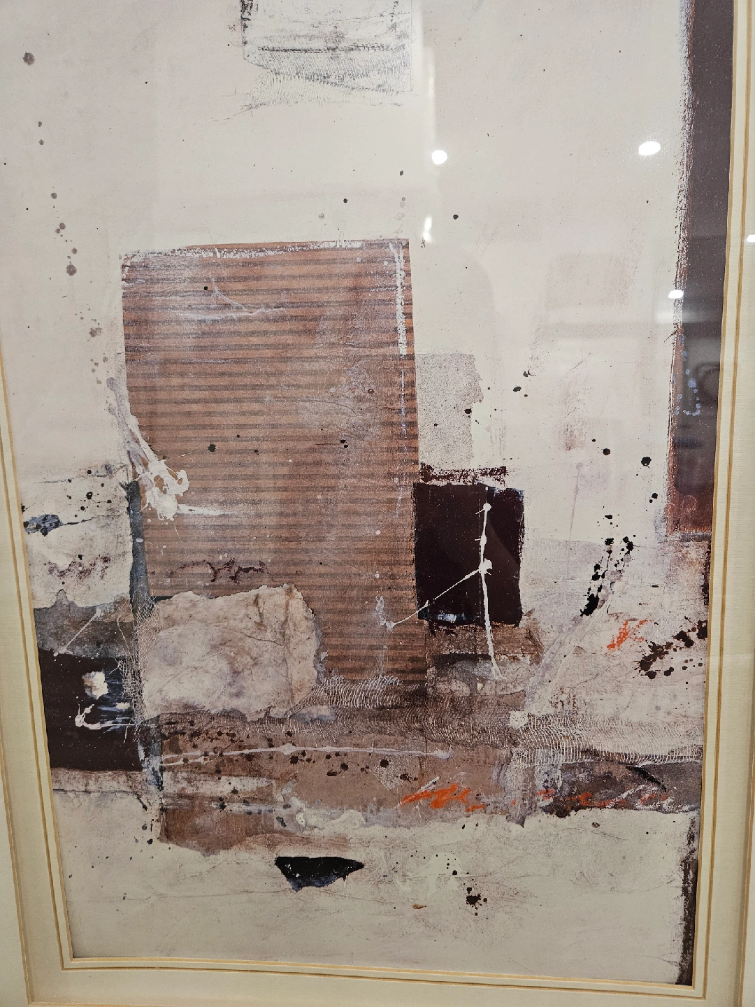 Selling this framed abstract art piece. It features a mix of textures and colours, perfect for adding a modern touch to any room. The frame is black and in good condition 25 x35 inch