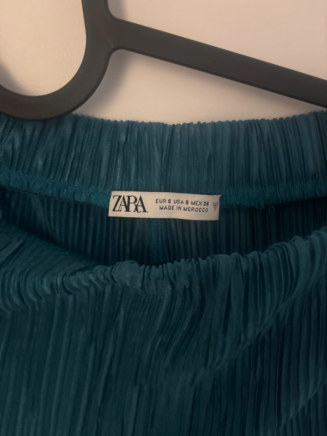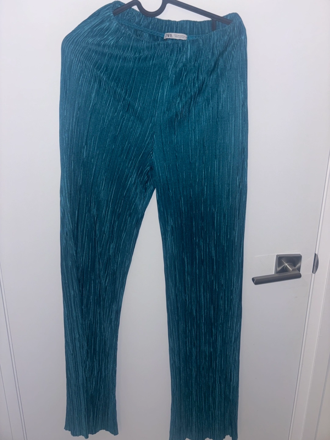 Selling a pair of Zara plisse pants in a beautiful teal colour! They're a size small and made in Morocco. These pants are super comfy and stylish. Perfect for dressing up or down, they're a great addition to any wardrobe