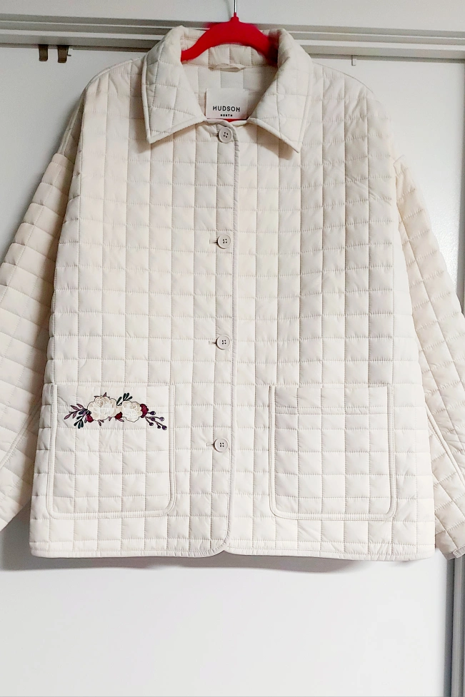 Cozy up in this cream-coloured quilted jacket from Hudson's Bay! It's a stylish and comfy piece, perfect for layering during those cooler Canadian days. The quilted design adds a touch of texture, and the floral embroidery gives it a unique charm. A great addition to any wardrobe!