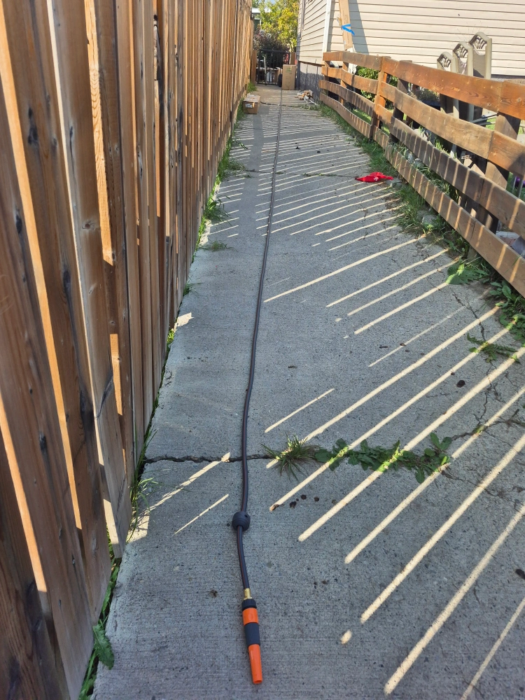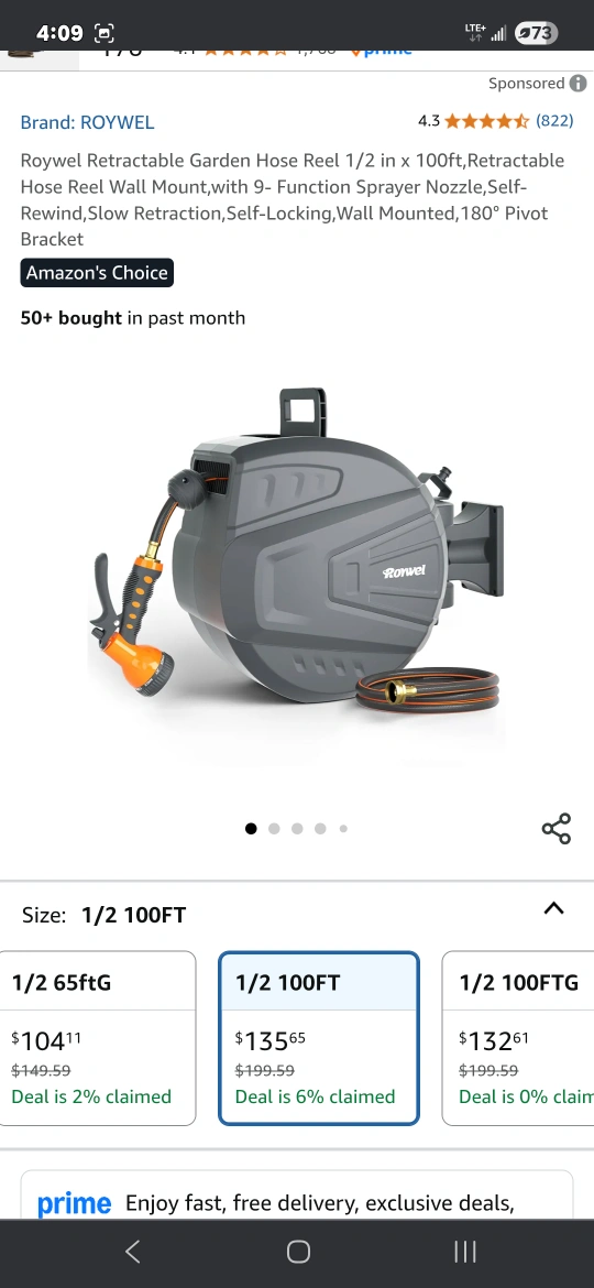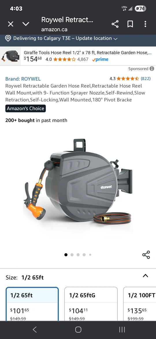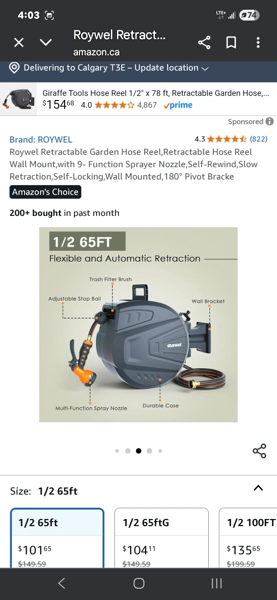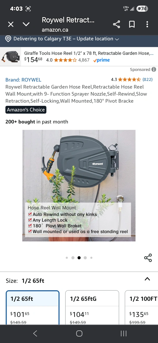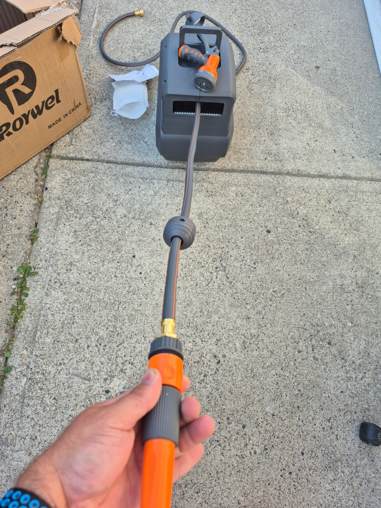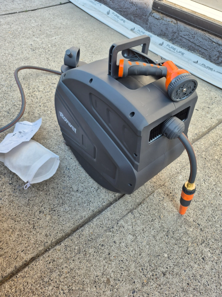 Selling a Roywel Retractable Garden Hose Reel in great condition! It's a 1/2 inch hose that stretches to 65 feet. It comes with a 9-function sprayer nozzle and has self-rewind and slow retraction features. Also includes a wall mount and 180° pivot bracket.