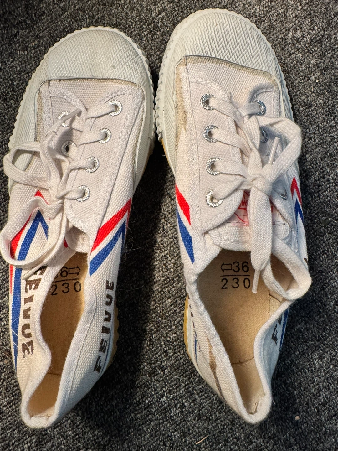 Selling a pair of Feiyue shoes in size 36 (230). These are in good condition, perfect for casual wear or martial arts training! They feature the classic Feiyue design with red and blue stripes. The soles are durable and provide good grip.
