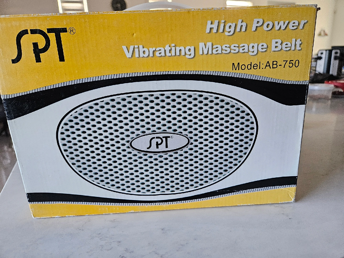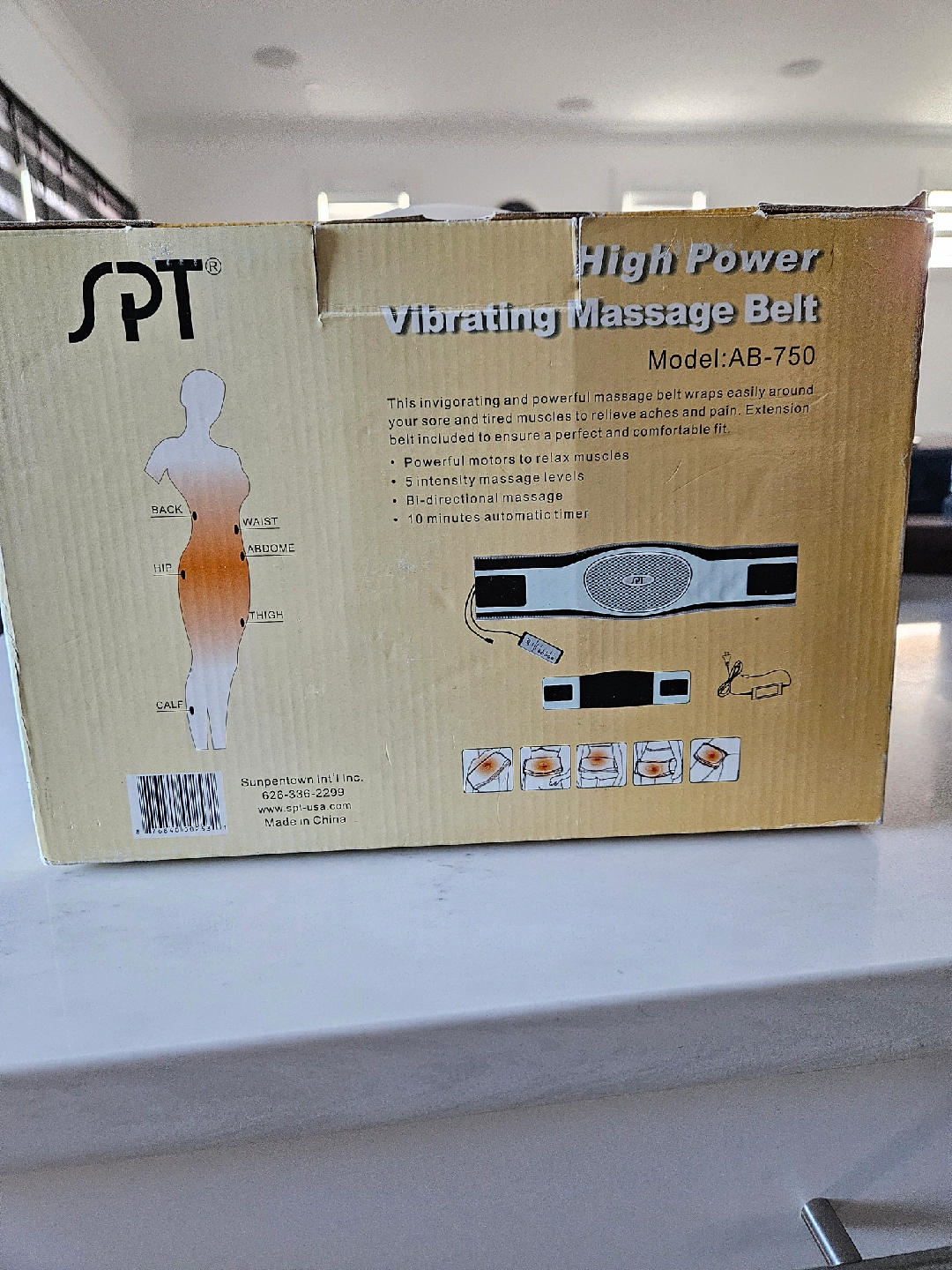 This is a SPT High Power Vibrating Massage Belt, model AB-750. It's designed to invigorate and massage your sore and tired muscles to relieve aches and pain. The extension belt is included to ensure a perfect and comfortable fit. Key features include: - Powerful motors to relax muscles - 5 intensity massage levels - 10 minutes automatic timer