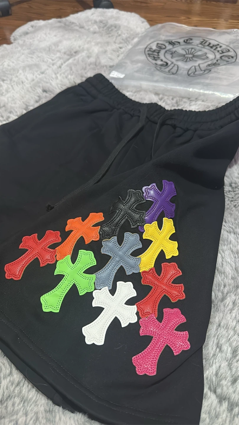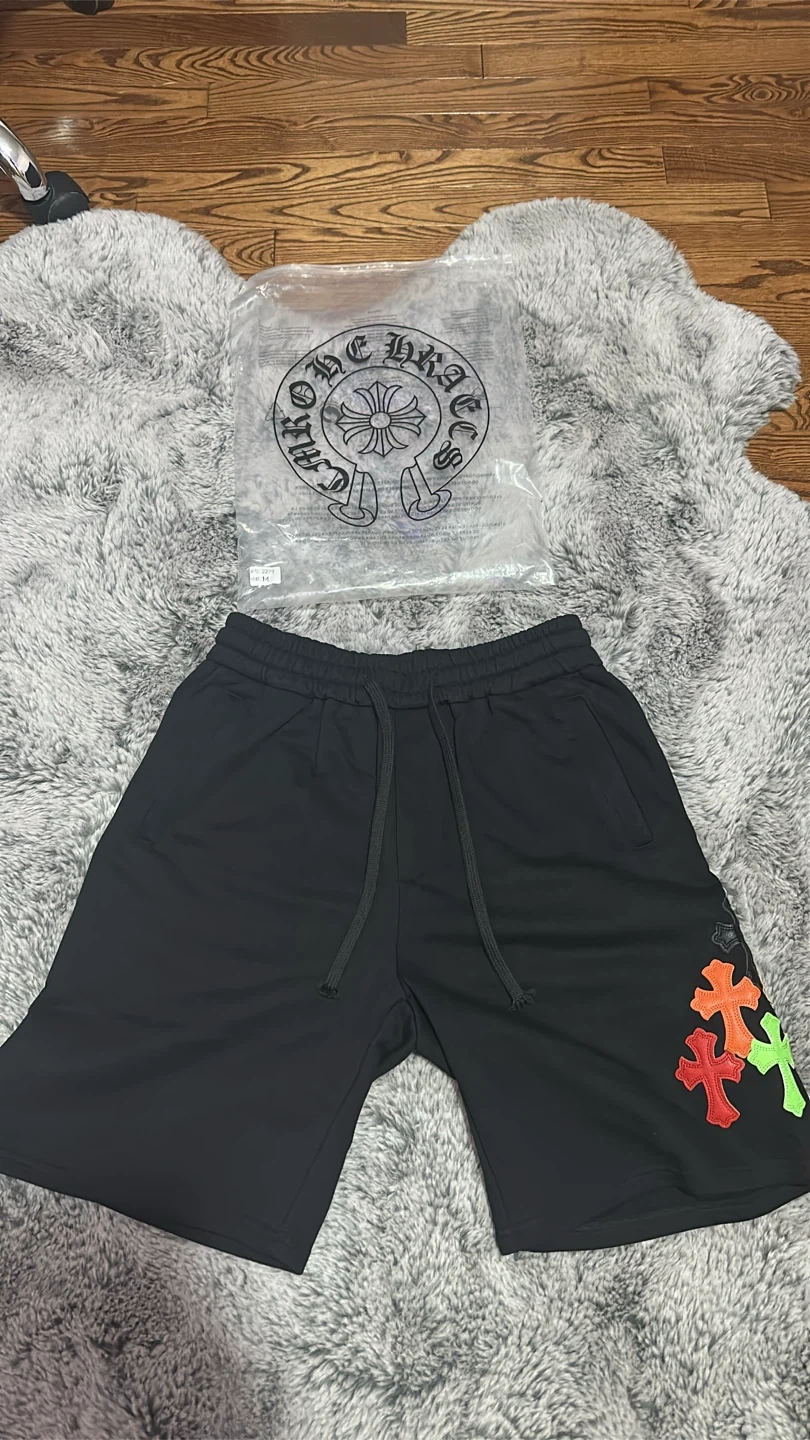 Selling a brand new pair of Chrome Hearts shorts! These black shorts feature colourful cross designs on the side. They still have the original tags attached, never worn!