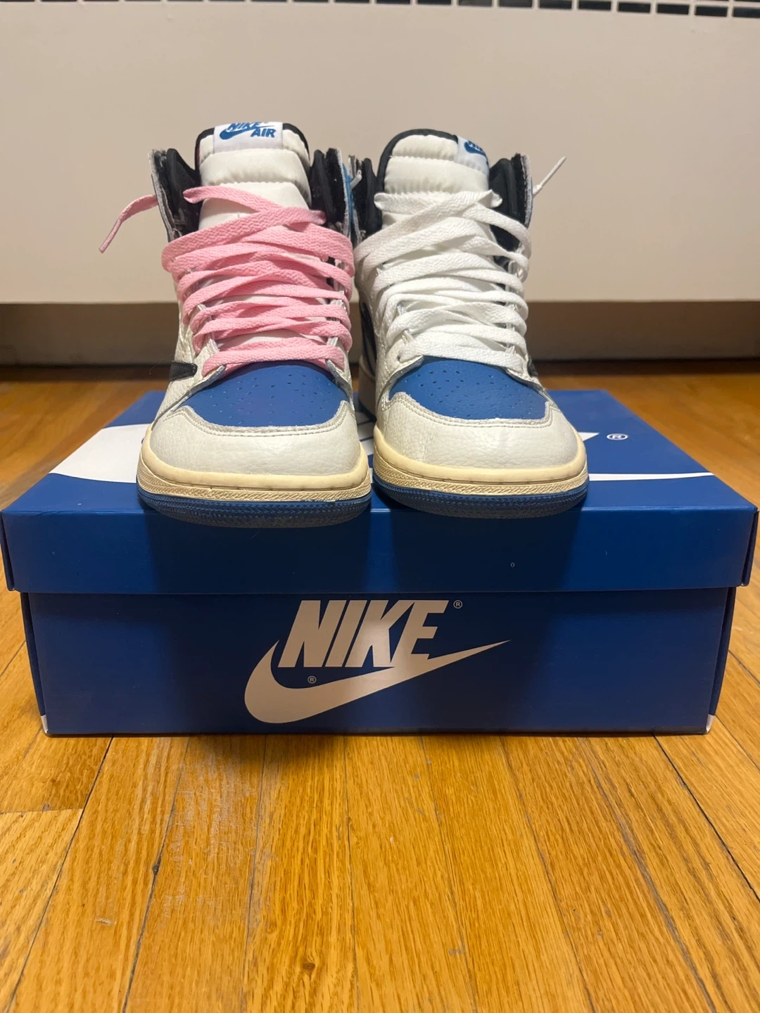 Nike Air Jordan 1 Retro High Travis Scott shoes in size 9. The shoes come with the original box. Featured in sail/black-military blue colourway. One shoe has pink laces and the other has white laces.