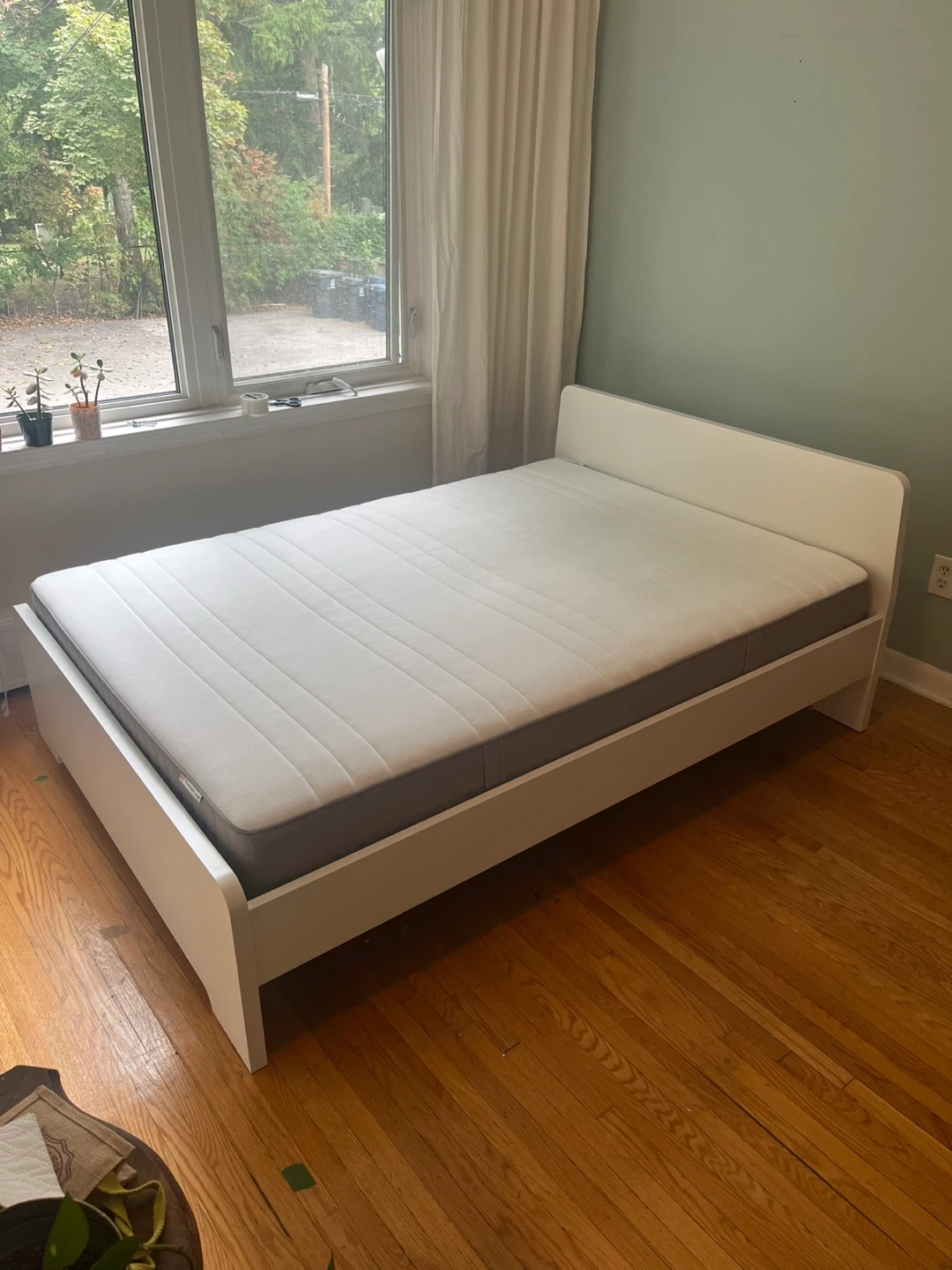 Please read description. ST CLAIR AND KEELE AREA. This is a full/double that isn’t on the IKEA website anymore. Link to Queen size below. This bed and mattress has been well maintained. The mattress remained covered by 4 layers during use. No stains, the only marks are on the bottom that happened during moving (see pics.) Mattress is Medium Firm. The frame has some minor nicks and cracking (see pics). The frame has been disassembled. Comes with instructions and hardware. https://www.ikea.com/ca/en/p/askvoll-bed-frame-white-luroey-s99030480/h
