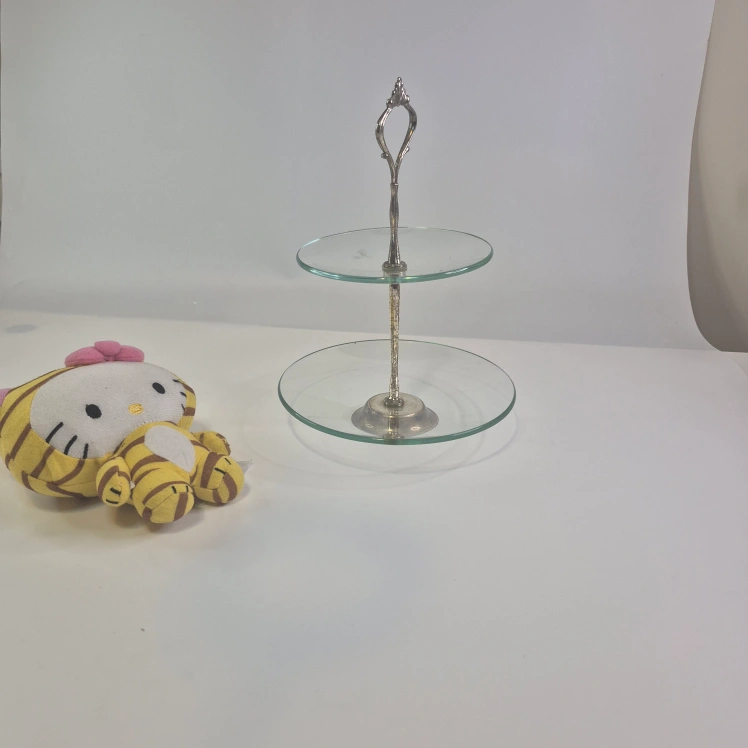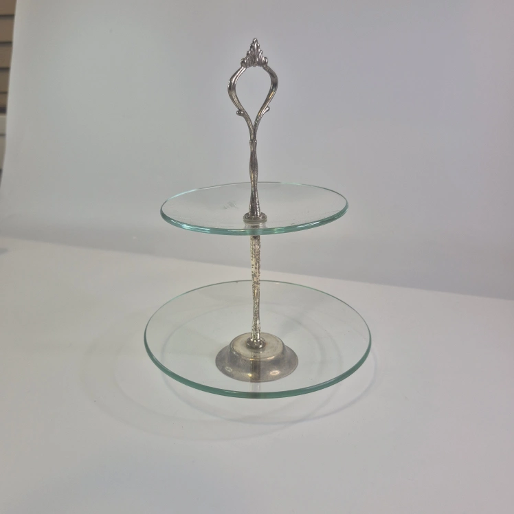 Selling a lovely two-tier dessert stand! It's perfect for displaying cakes, pastries, or appetizers. The glass plates are in great shape, and the silver-toned stand adds a touch of elegance to any table. Great for parties or everyday use