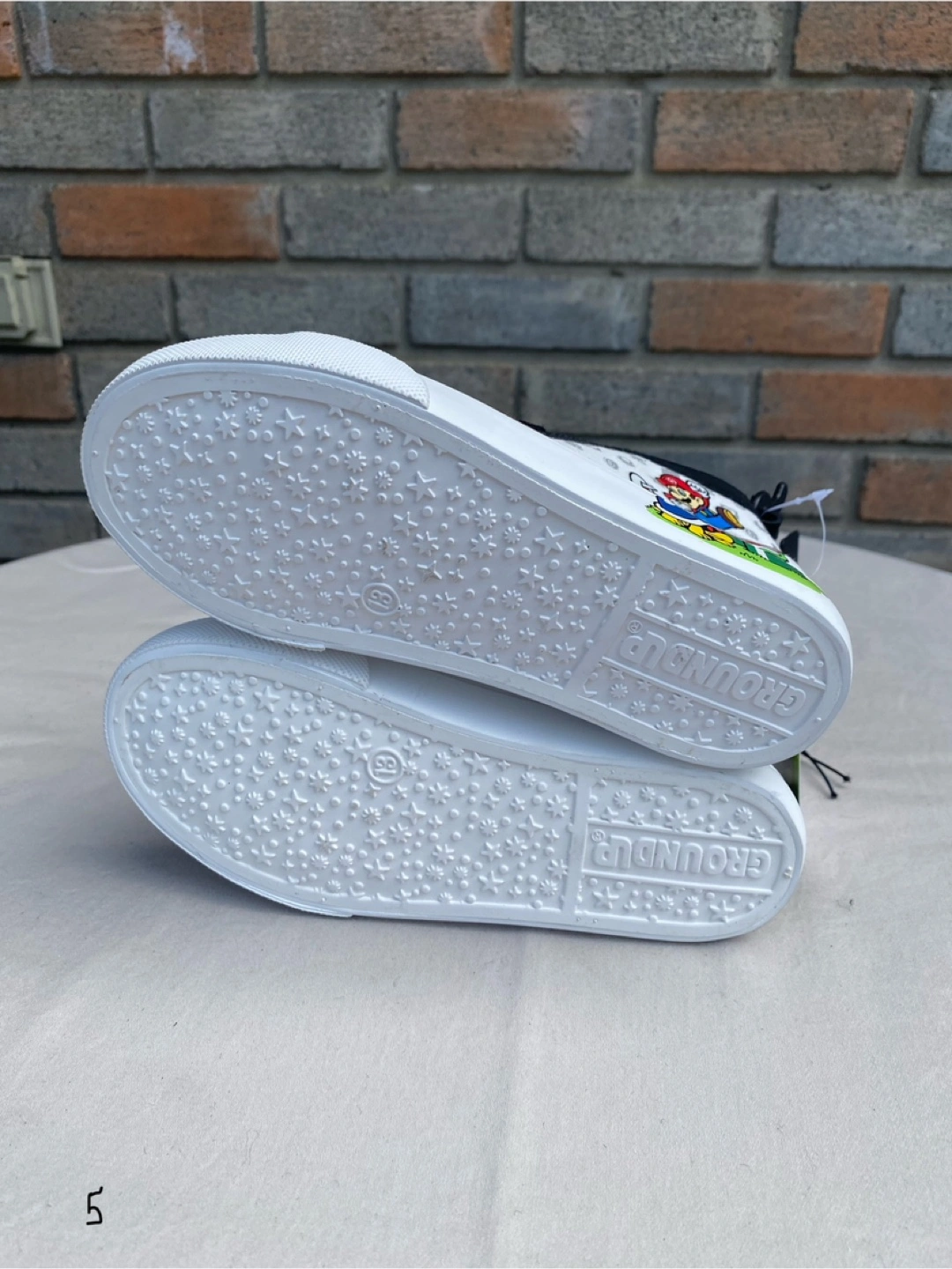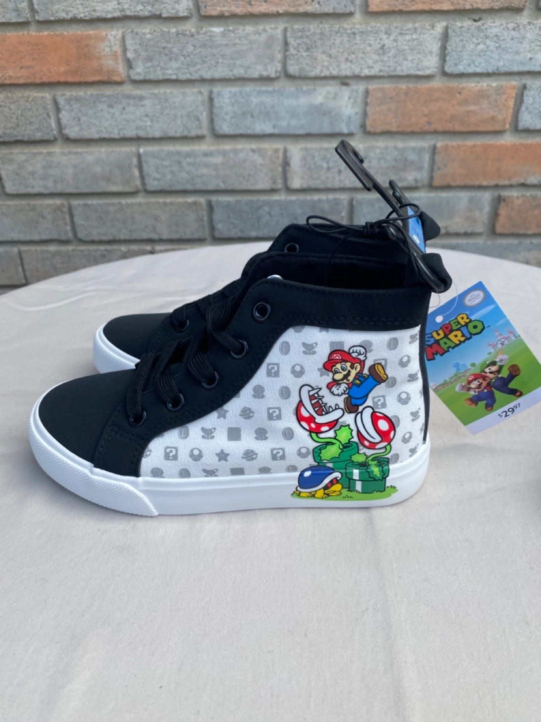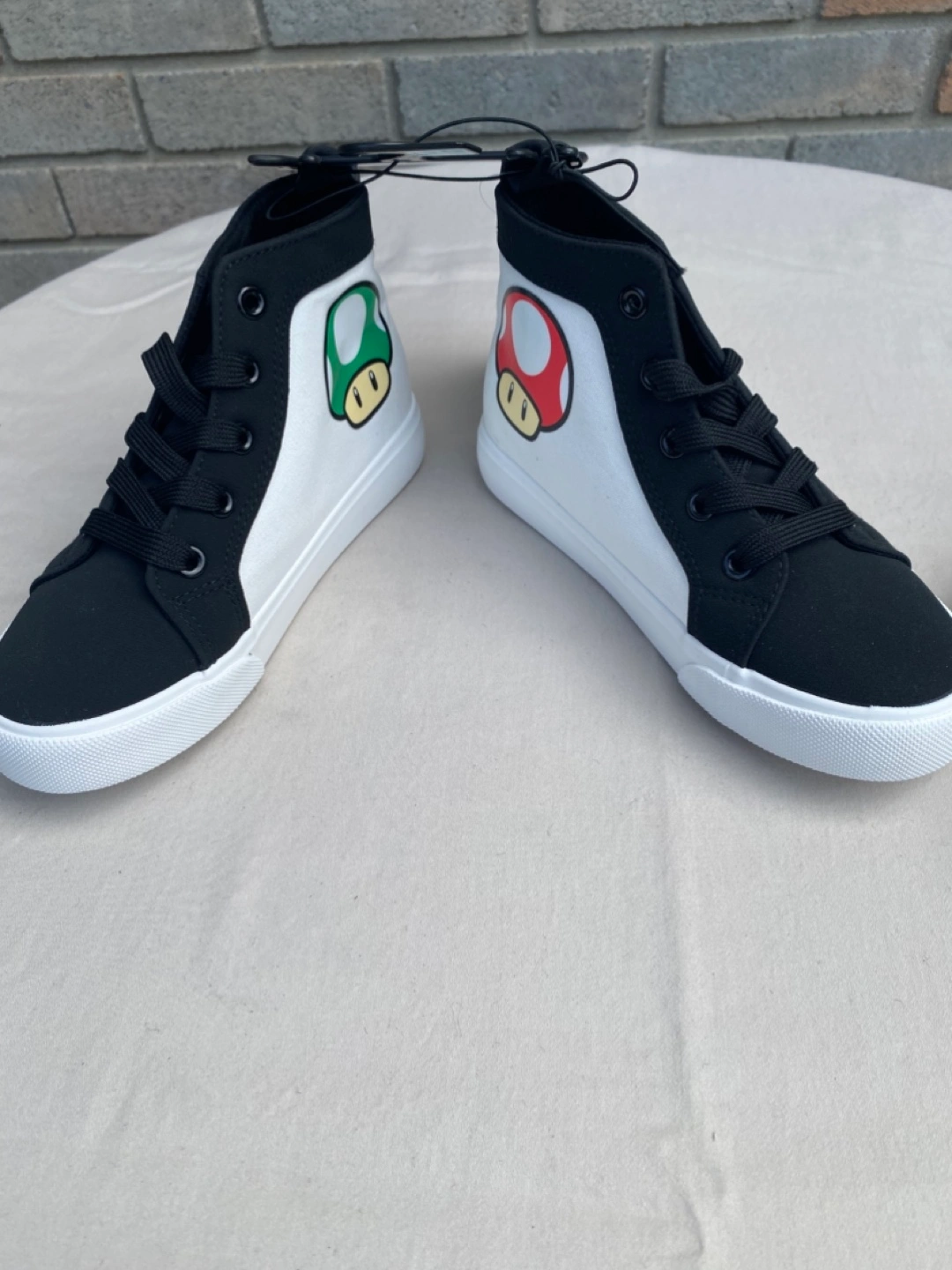 These Super Mario high top sneakers are brand new with tags! They feature a fun design with Mario, Luigi, Yoshi, and Toad, plus mushroom details. Available in sizes US kids 13 and 1 From clean, pet-free, smoke-free home Pick up only in Acadia SE Price is firm Please check my other ads Shipping is available at buyers’ expense