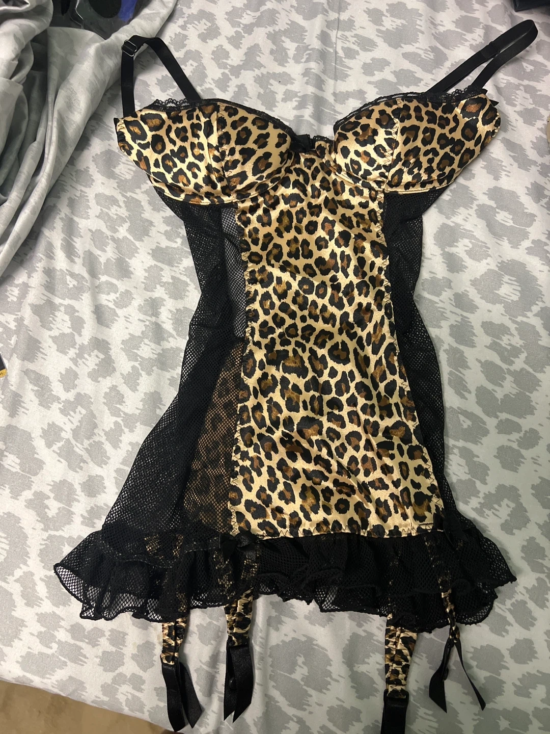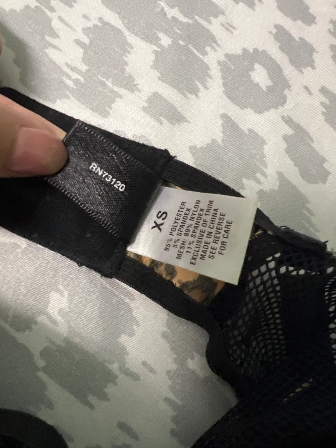 Frederick's of Hollywood lingerie in size XS. It's black with a leopard print panel. The material is 95% polyester and 5% spandex