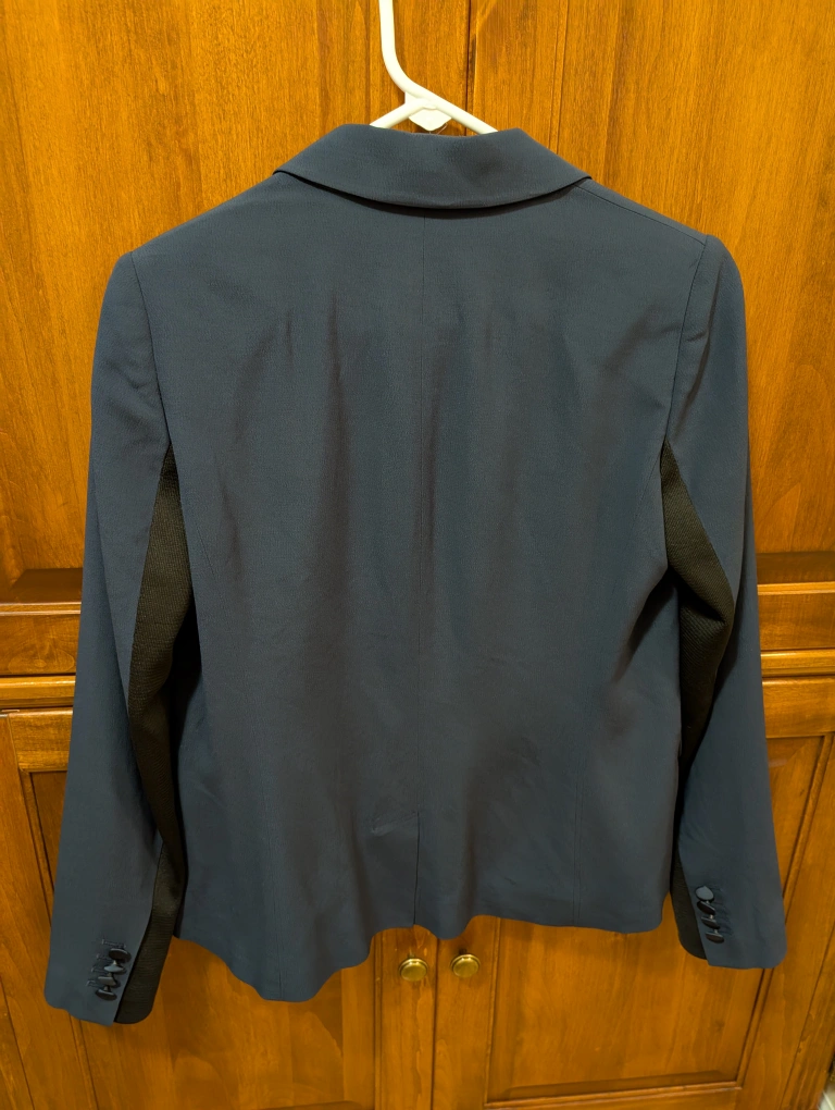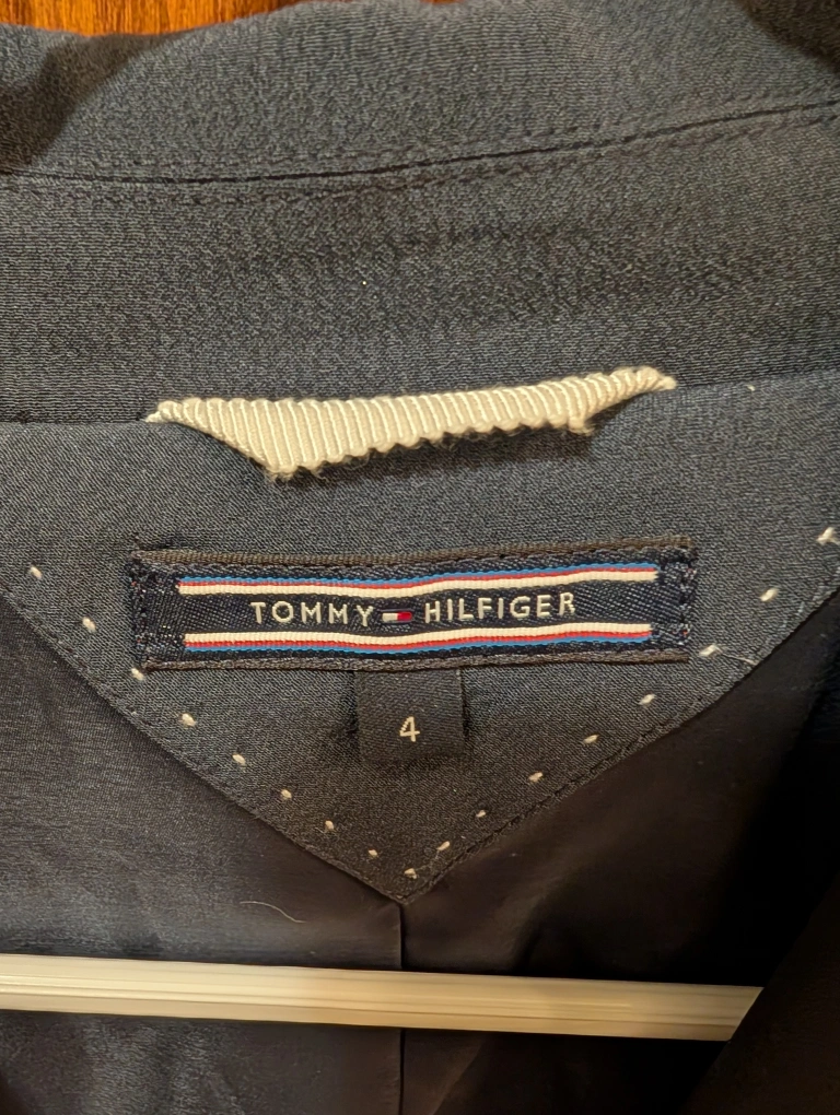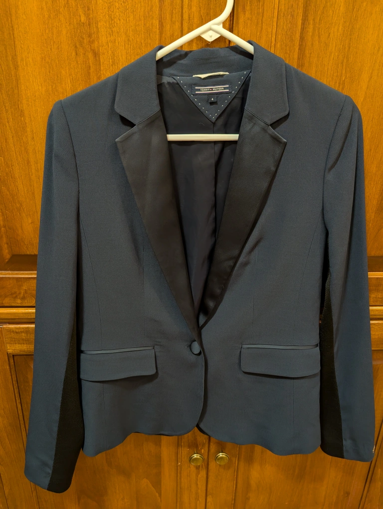 Tommy Hilfiger blazer in a sleek, dark blue colour. It's a size 4 and features stylish black accents. Perfect for adding a touch of sophistication to any outfit! pickup in Kitsilano