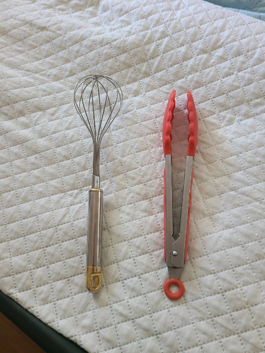Selling a kitchen whisk and tongs. Both are in great shape and ready for your cooking needs! Perfect for whipping up a batch of cookies or grilling some veggies