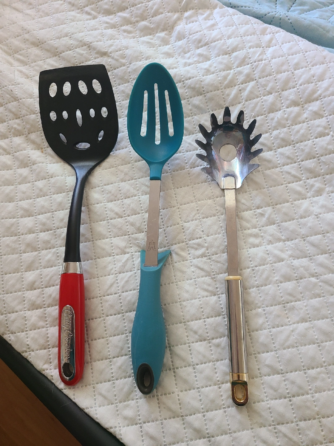 Set of kitchen utensils! Includes a Betty Crocker slotted spatula with a red handle, a slotted spoon with a teal handle, and a spaghetti server