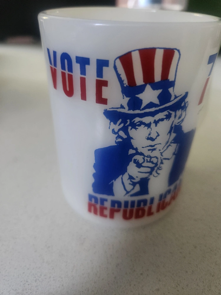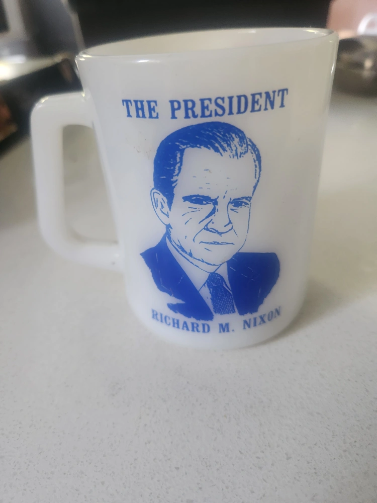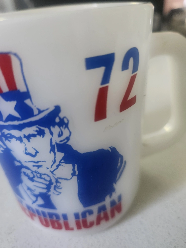 Vintage 1972 campaign mug - political memorabelia. No chips or scratches. On the bottom, embossed, it says "heat proof USA" plus an "F" inside an outline of a crest, suggesting The Federal Glass Company" as the manufacturer (hard to photograph).