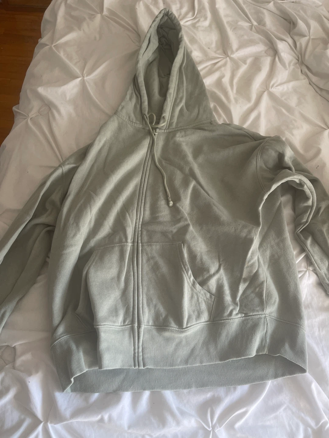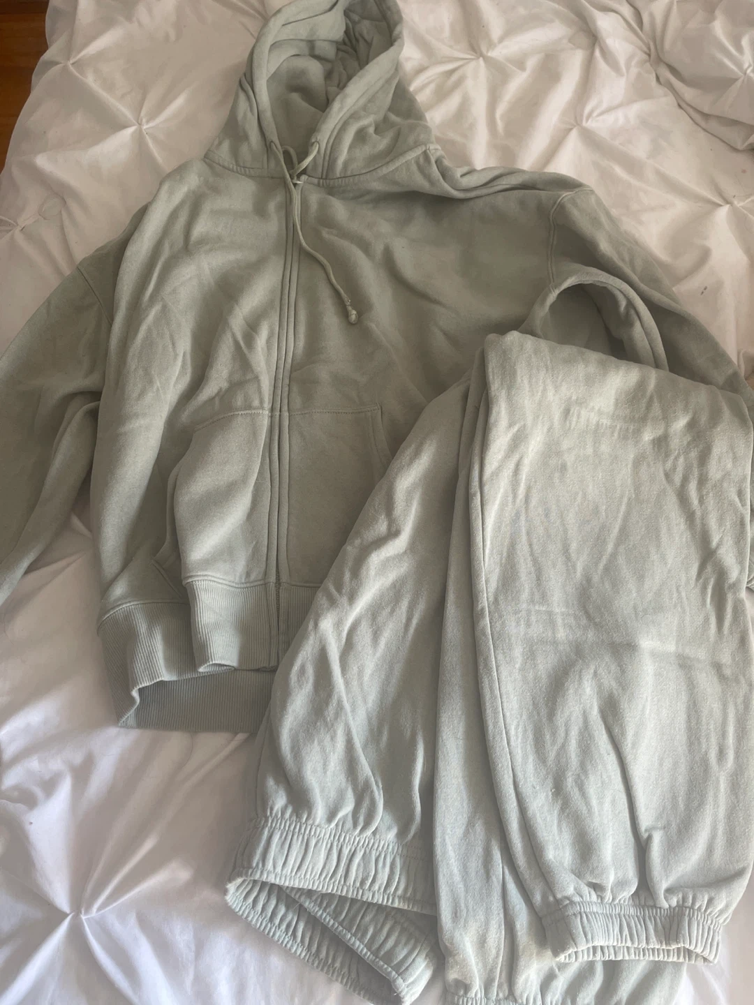 Selling a super comfy No Boundaries Fleece set! It includes a oversized zip-up hoodie and matching sweatpants. The set is in a lovely light green colour and is perfect for lounging or running errands. The material is soft and cozy, perfect for the Canadian weather!