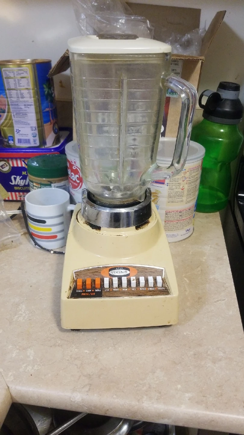Selling a vintage Viking blender. It has settings for grate, chop, grind, stir, puree, whip, mix, blend, liquefy, and frappe. It's in used condition.