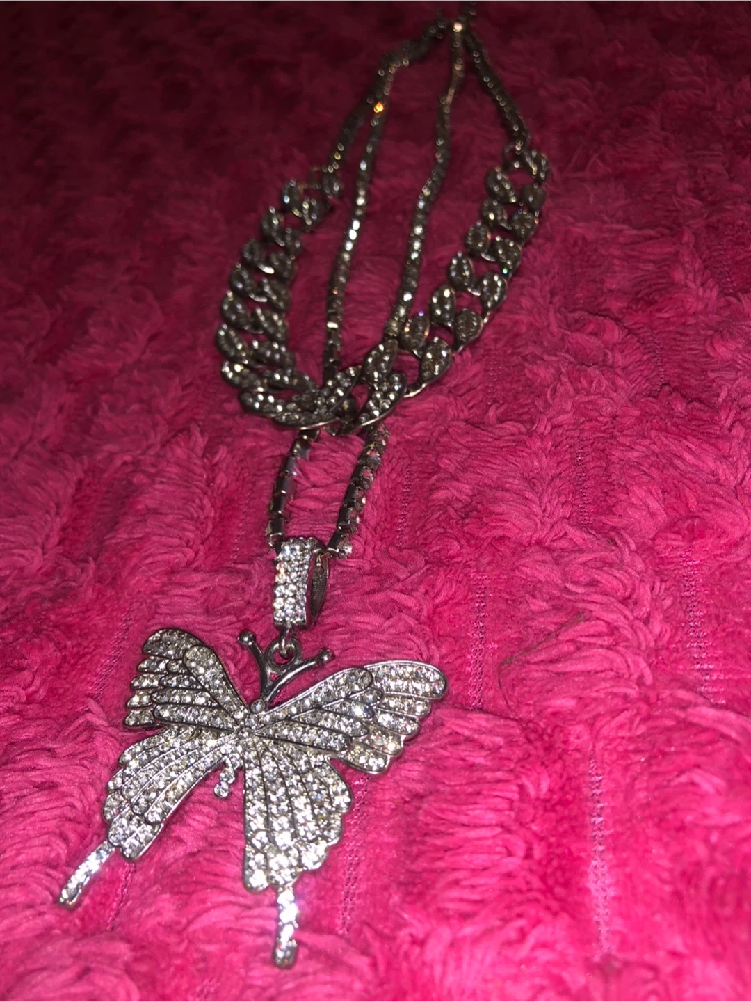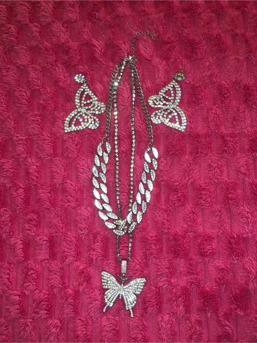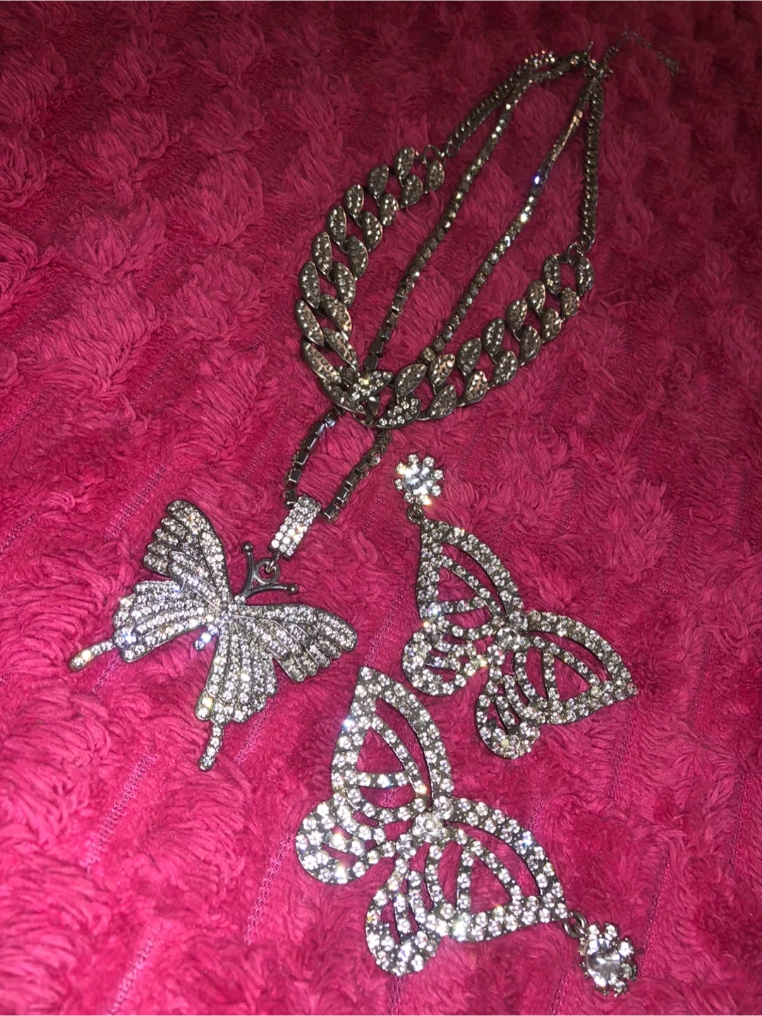 Selling a beautifully faux diamond studded butterfly pendant necklace with matching earrings! The set is silver coloured and features sparkly rhinestones. Perfect for adding a bit of sparkle to any outfit! No tarnishing or wear nβ tear! No stones missing! Let me know if interested in purchasing from me thx ππ Check out my listings for more deals! π€© π₯ Bundle items for a discounted price (excluding items $5 and under)π₯ Pick up at Moss Park Apartments (exact address will be given once a meetup is decided) π
