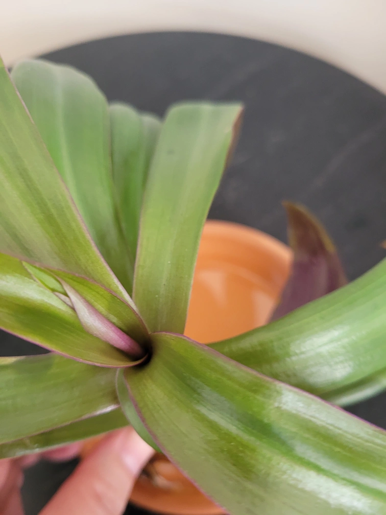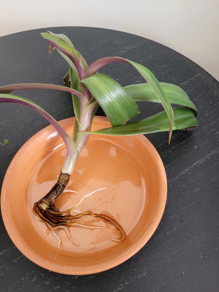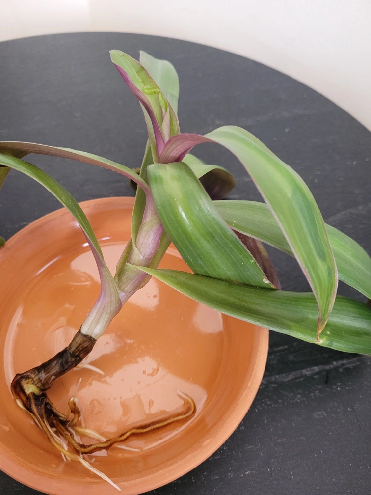Well rooted cutting. It's a beautiful plant with striking green and purple striped leaves. It's currently rooting in water and ready to be potted.