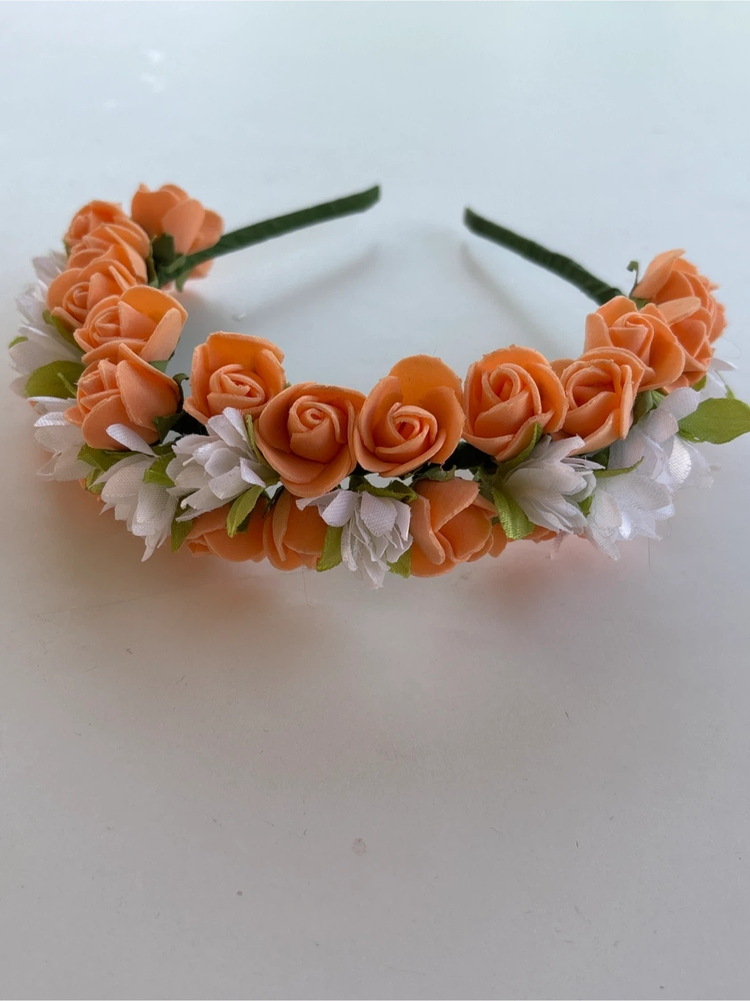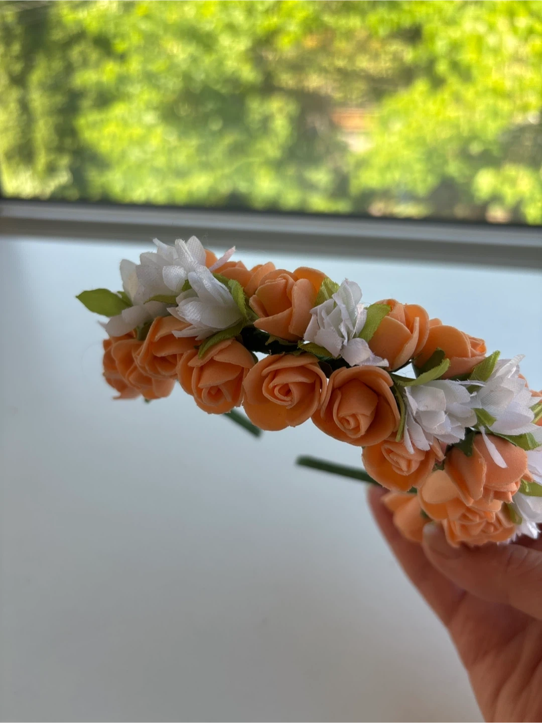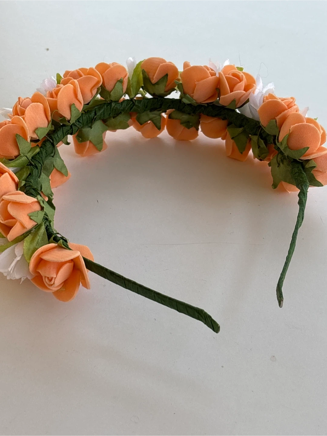 A cute orange floral headband! Perfect for adding a touch of spring to any outfit. The headband features small orange rose-like flowers and white accents. It's in great condition and ready for a new home