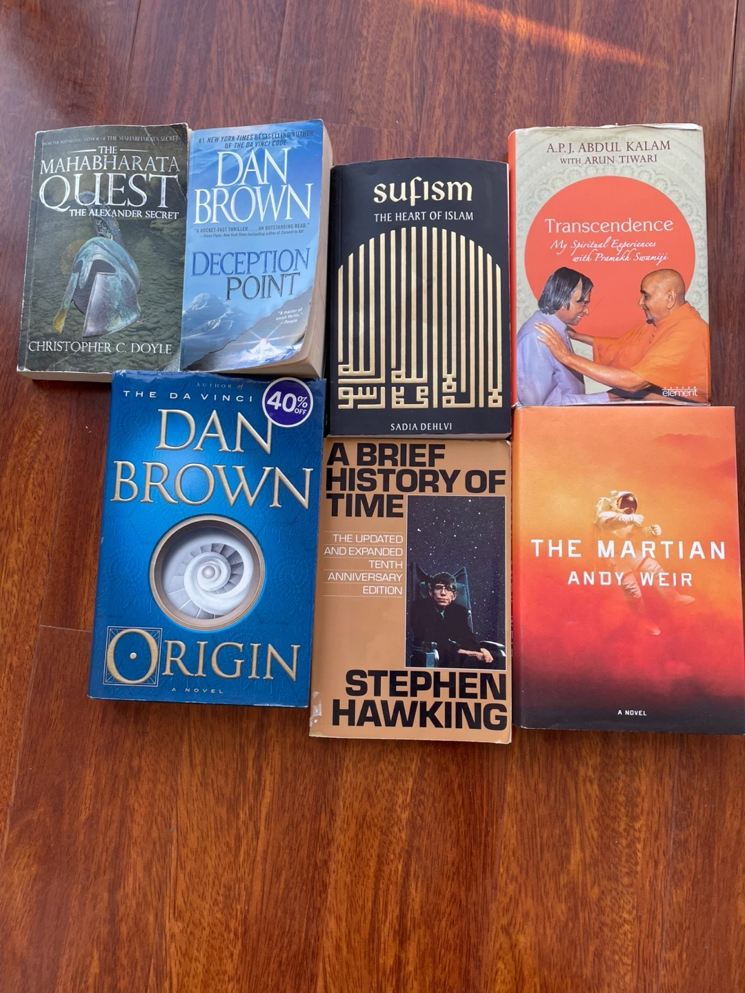 Selling a mixed lot of books, including titles by Dan Brown, Stephen Hawking, and others! Great for anyone looking to expand their reading collection. Titles include: - The Mahabharata Quest by Christopher C. Doyle - Deception Point by Dan Brown - Sufism: The Heart of Islam by Sadia Dehlvi - Transcendence by A.P.J. Abdul Kalam with Arun Tiwari - Origin by Dan Brown - A Brief History of Time by Stephen Hawking - The Martian by Andy Weir