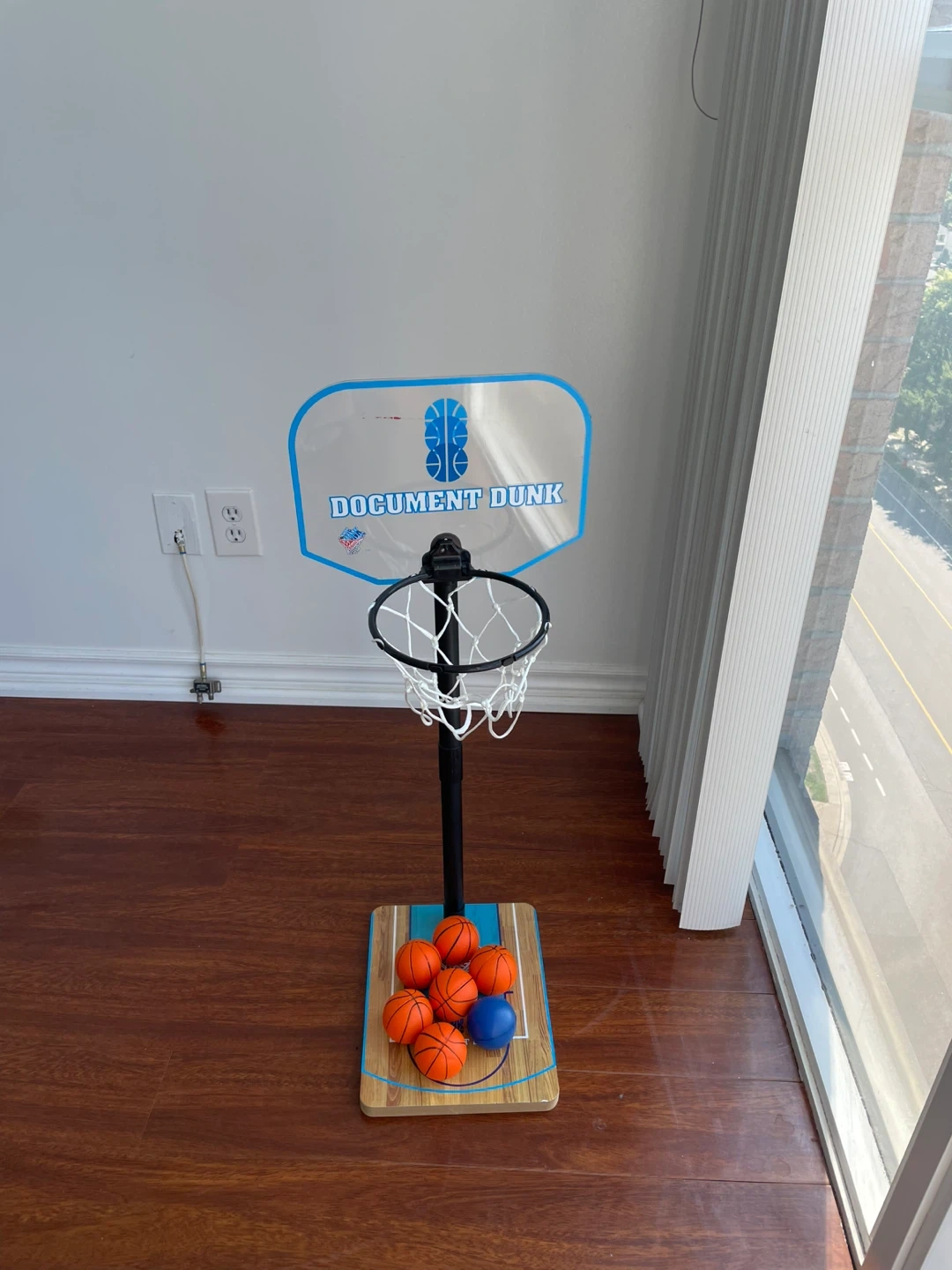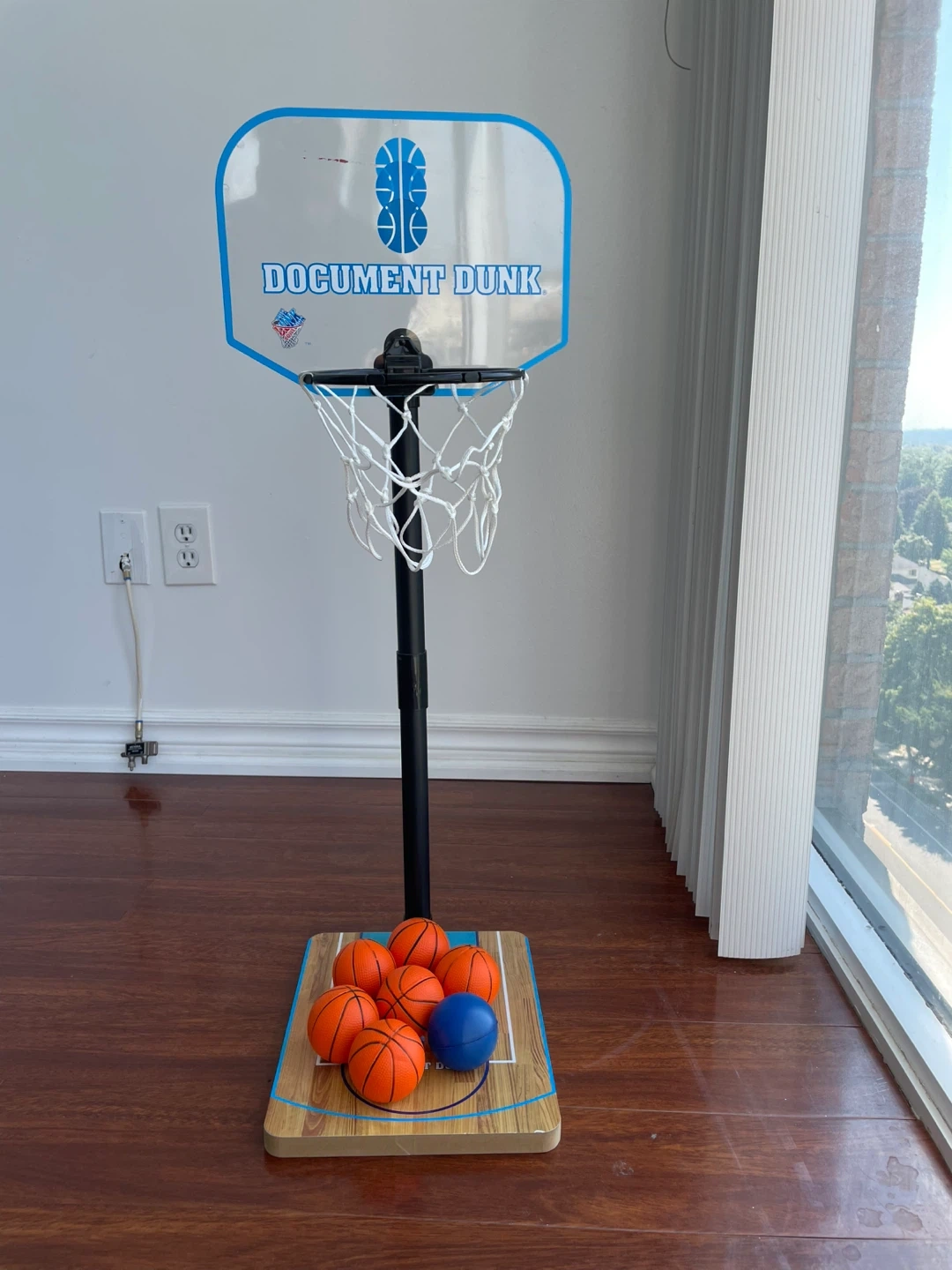 Get ready to shoot some hoops with this Document Dunk mini basketball set! It's perfect for some indoor fun. Comes with a mini hoop, net, stand, and several mini basketballs. Great for kids and adults alike!