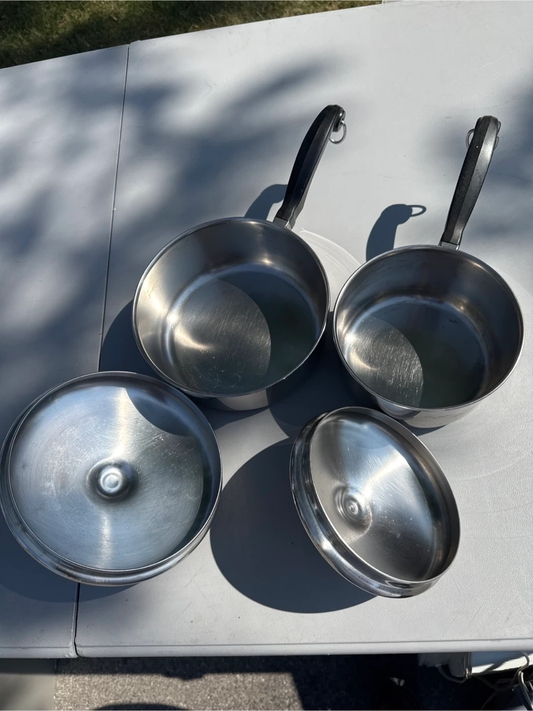 Selling a set of two stainless steel sauce pans, each with its own lid. They're in great shape and ready for a new kitchen! Perfect for cooking up sauces, soups, or anything else you need