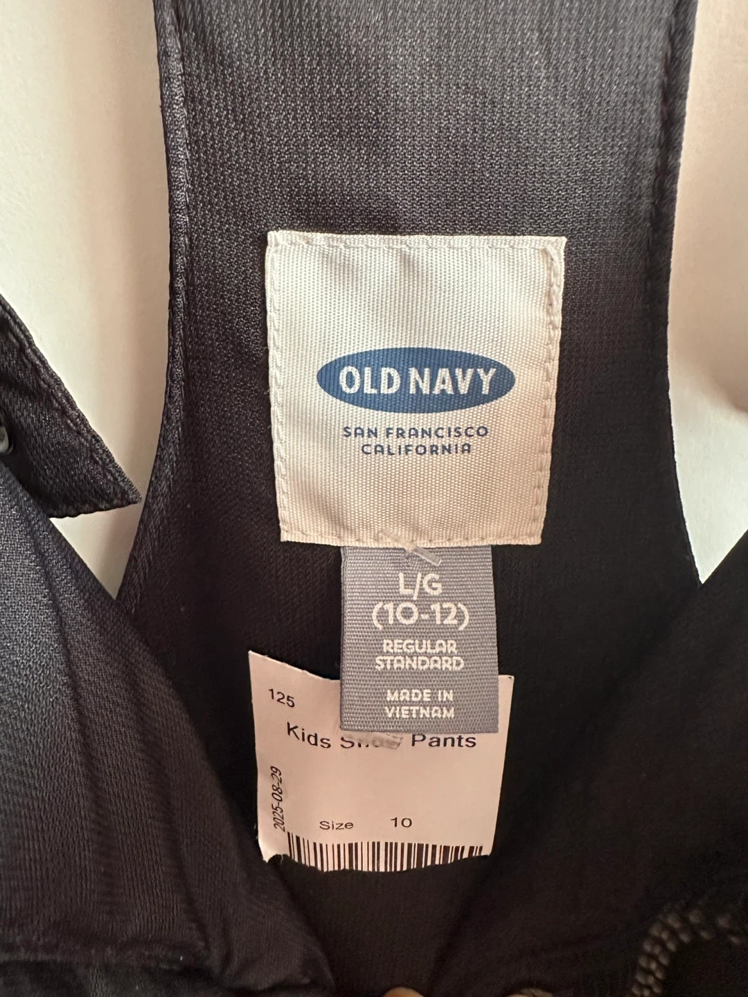 Selling a pair of Old Navy kids snow pants. They're black and in size L/G (10-12). Perfect for keeping your little one warm and dry this winter! Pay by cash please