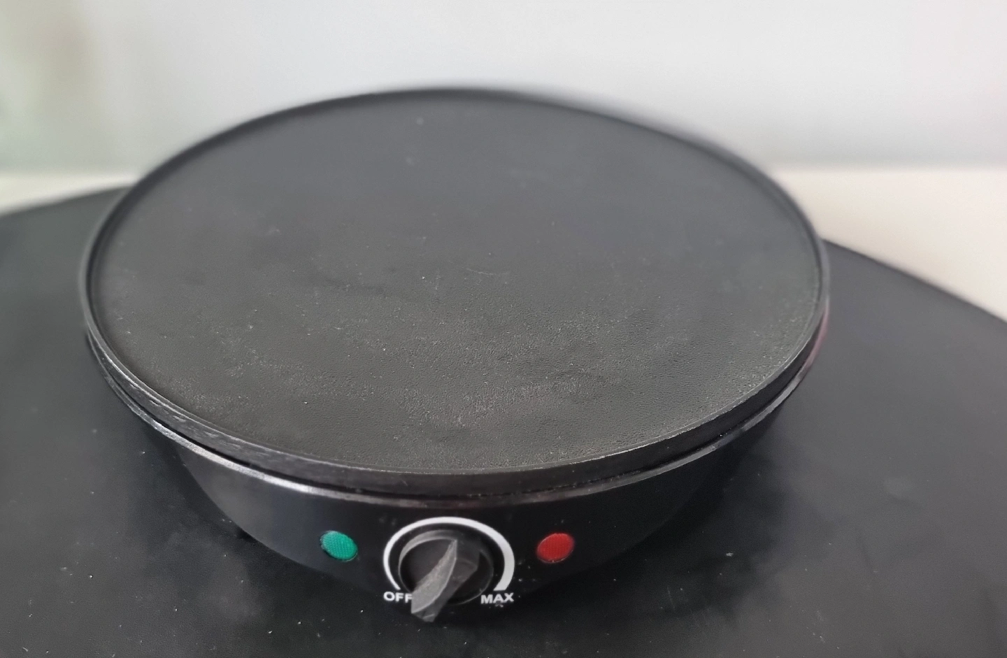 Selling a JYDOMIX Crepe Maker in excellent condition! It's perfect for making delicious crepes at home. The dimensions are approximately 11 inches in diameter. It has a power rating of 120V, 60Hz and 1300W.