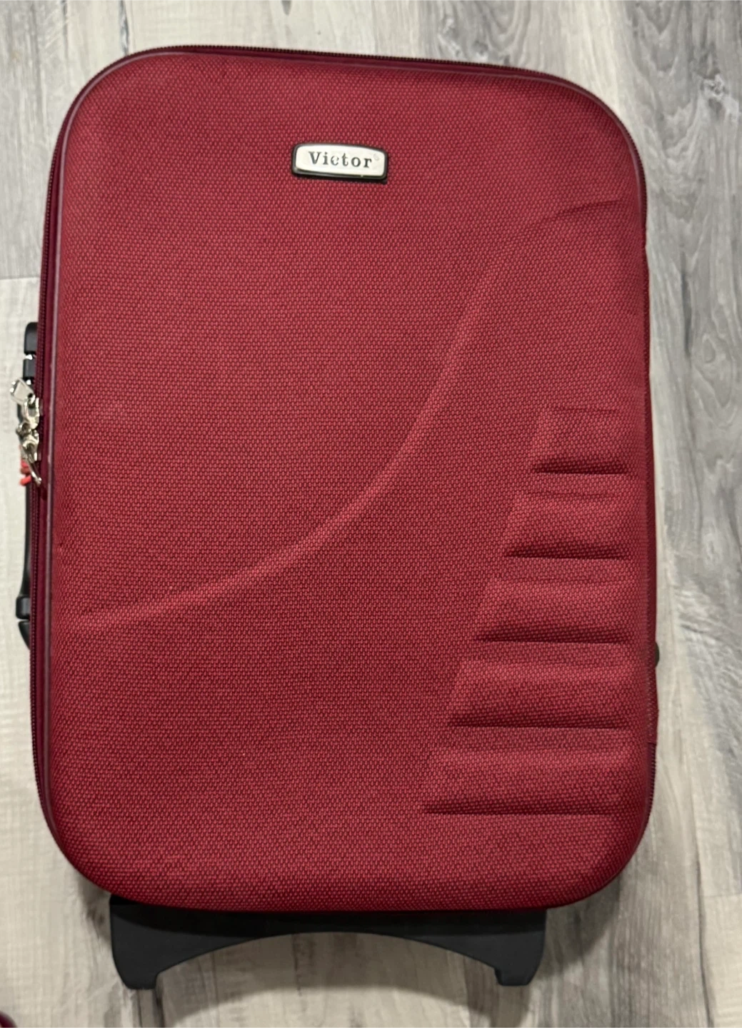 Selling a Victor carry-on suitcase in burgundy. It's in great shape and ready for your next trip! It features a retractable handle, wheels for easy transport, and a combination lock for security