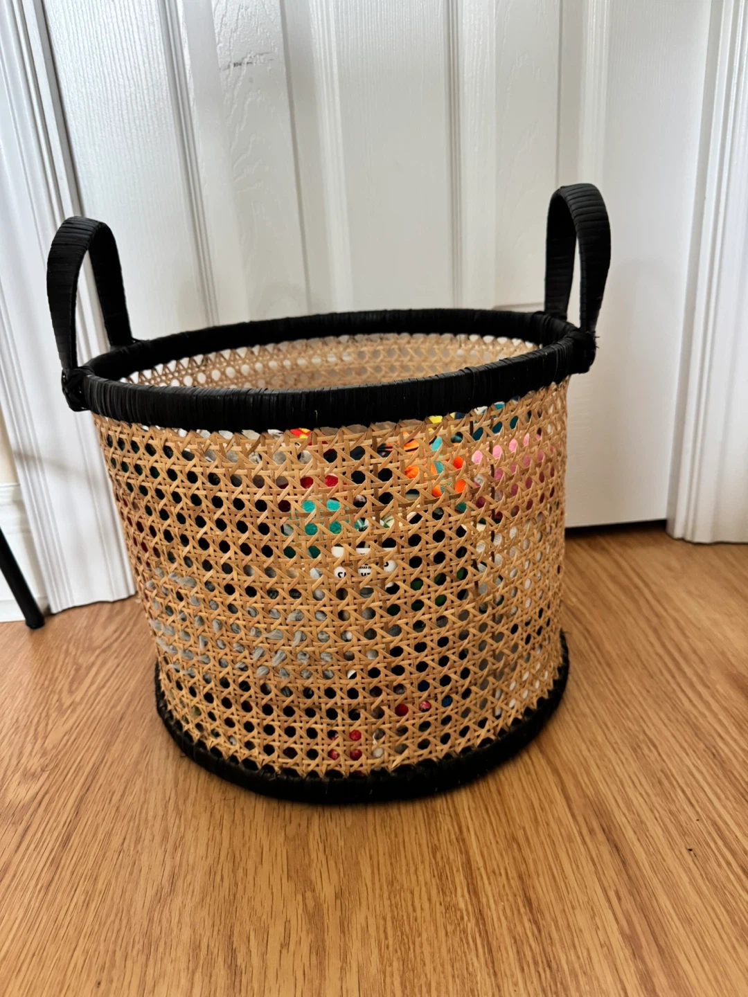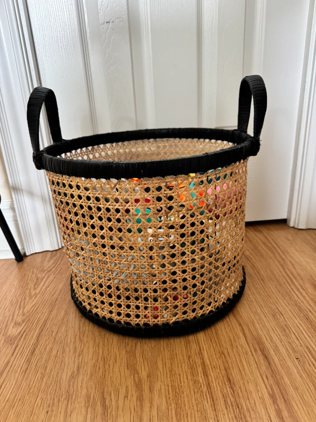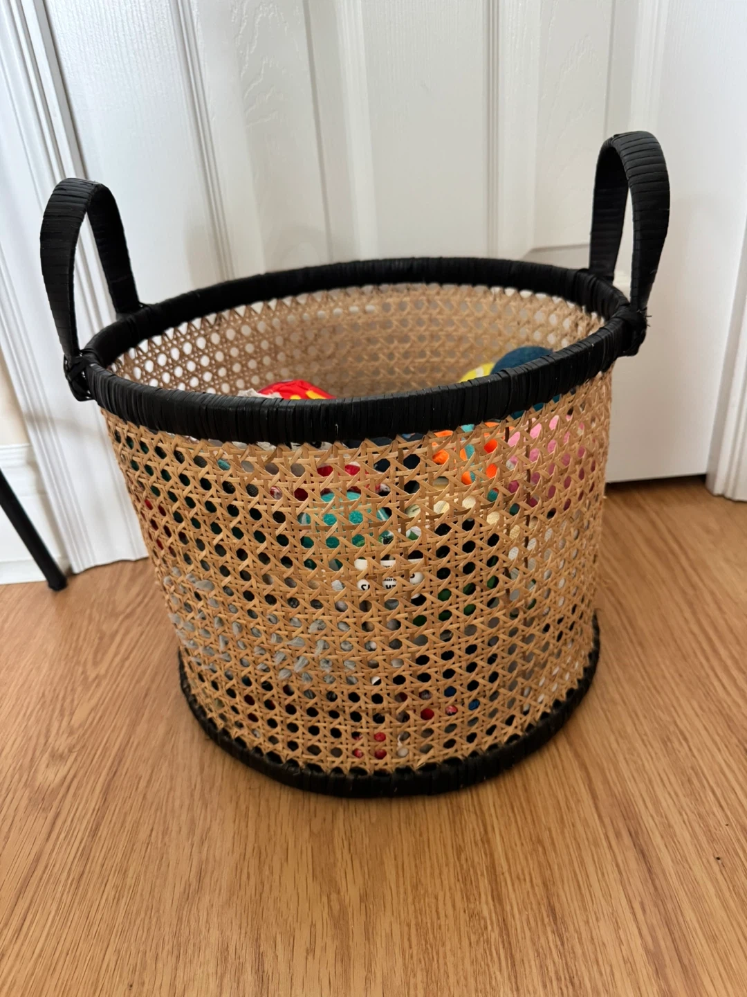 Selling a lovely rattan basket with black trim! It's perfect for storing toys, blankets, or other household items. The basket is in great condition and ready for a new home