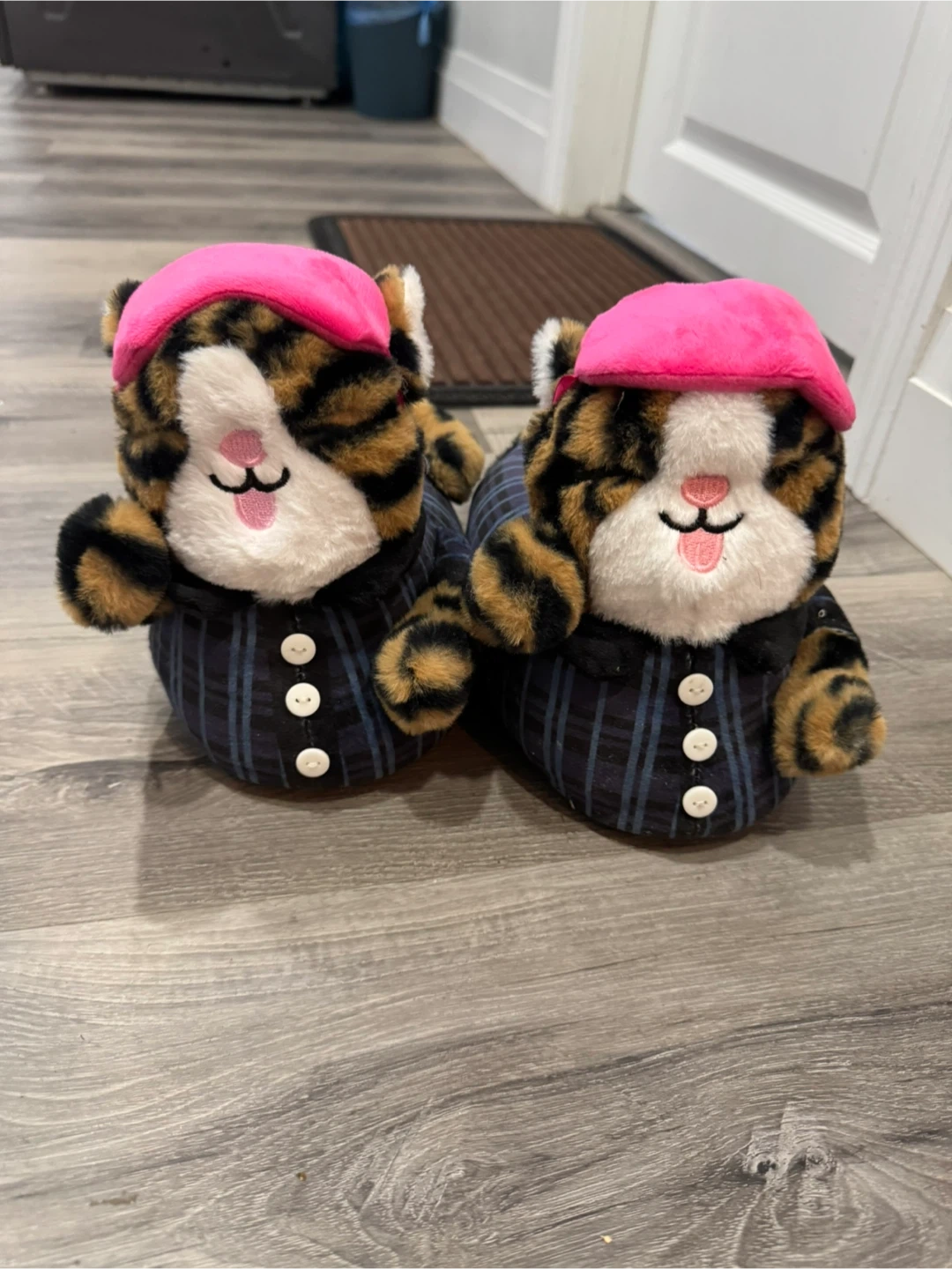 These adorable tiger slippers feature a charming design, complete with a cute pink beret! They are in great condition and ready to keep your feet cozy and warm. Perfect for lounging around the house! Size: 8/38