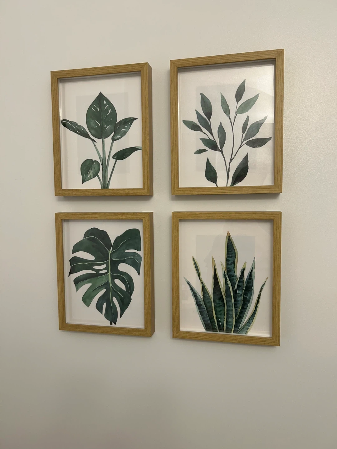 Spruce up your space with this set of four botanical wall art prints! Each print features a different plant illustration, adding a touch of nature to any room. The frames have a light wood tone that complements the greenery in the prints. These would look great in a living room, bedroom, or even an office space