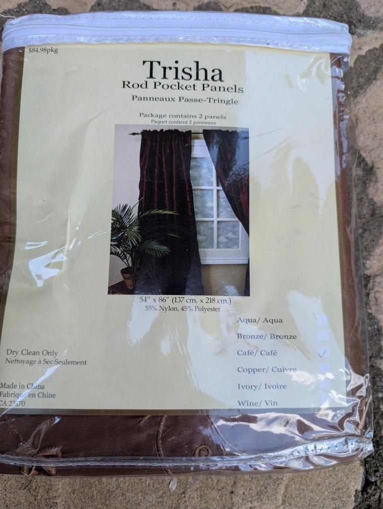 Selling a set of Trisha Rod Pocket Panels in a lovely café brown colour! They are 54" x 86" (137 cm x 218 cm) and made of 55% nylon and 45% polyester. The package contains 2 panels. Originally bought for $84.98
