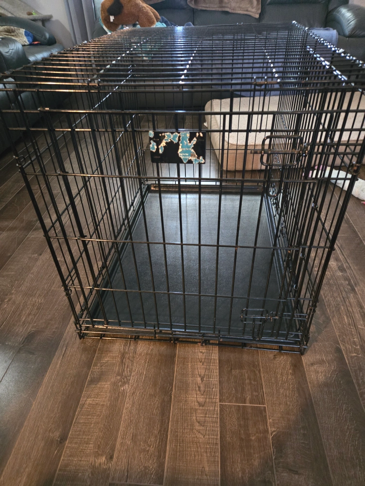 Selling a dog crate in great condition! It's a black wire crate that's perfect for your furry friend. It comes with a tray at the bottom for easy cleaning. Ready for a new home! 3ft long x 2.3ft high x 2ft wide.